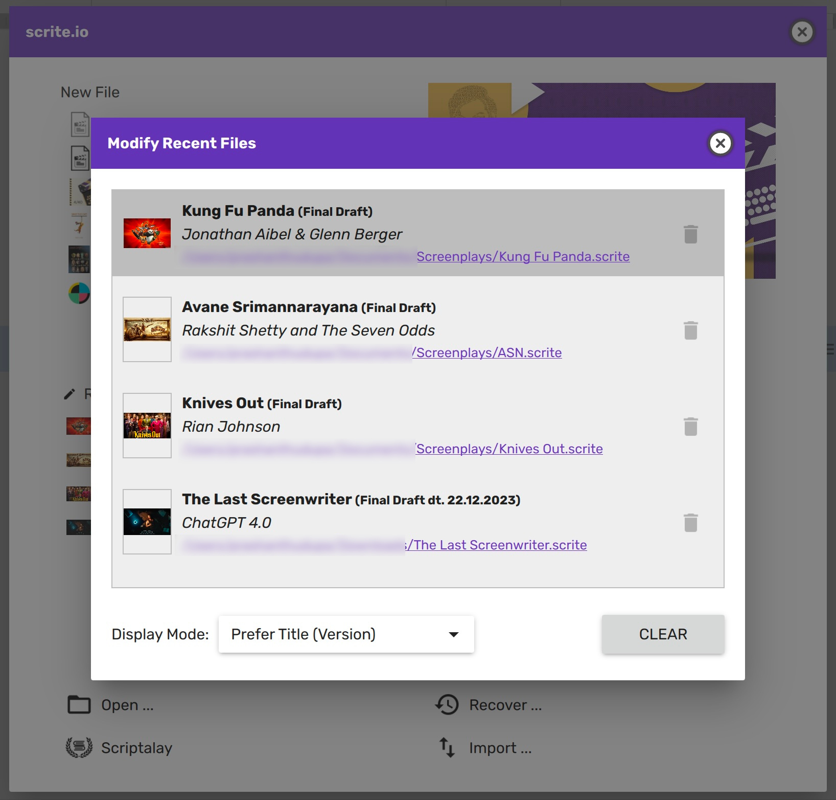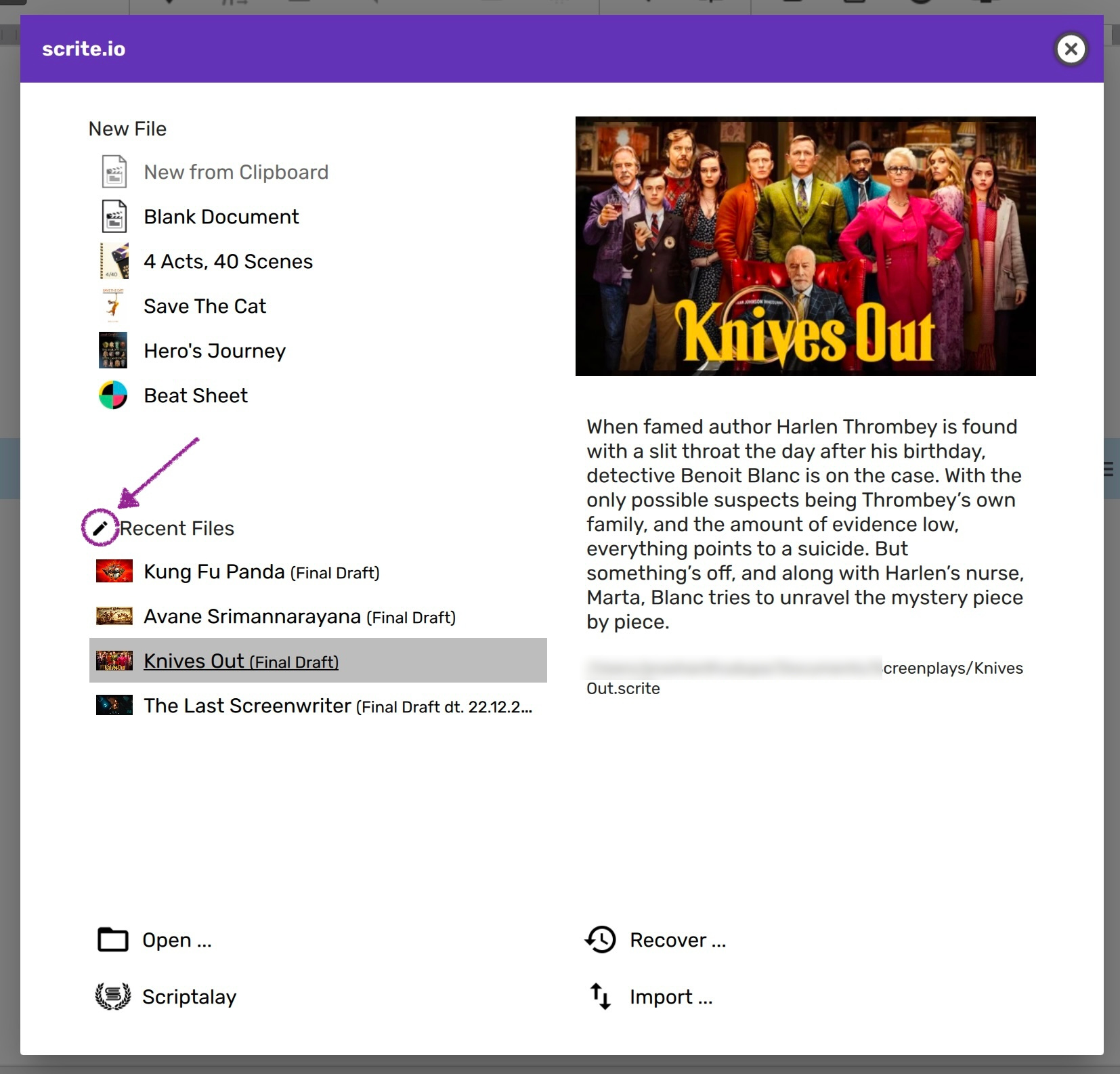 Scrite lists up to 10 recent files in the Home Screen. You can hover over any of the recently opened files to see the cover page, logline and authors. Simply click on a file you want and have Scrite open it. It's that simple.