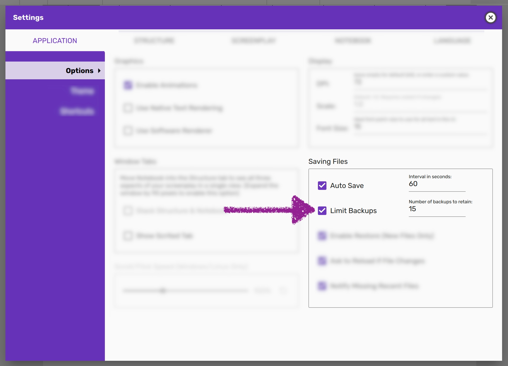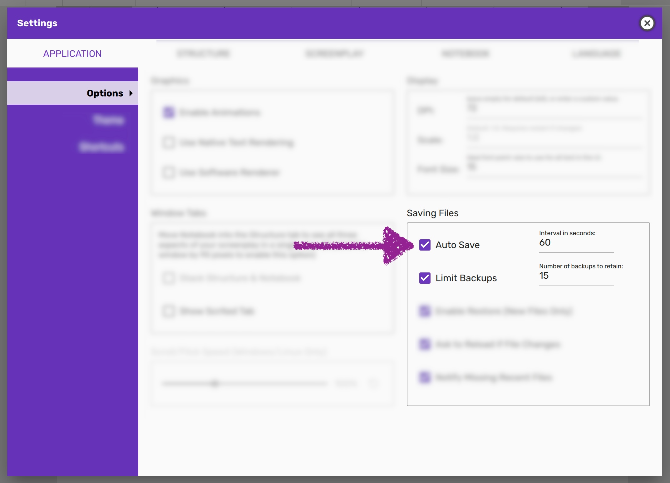 You can toggle auto‑save, change the interval, and limit the number of backups in Settings → Application → Options.