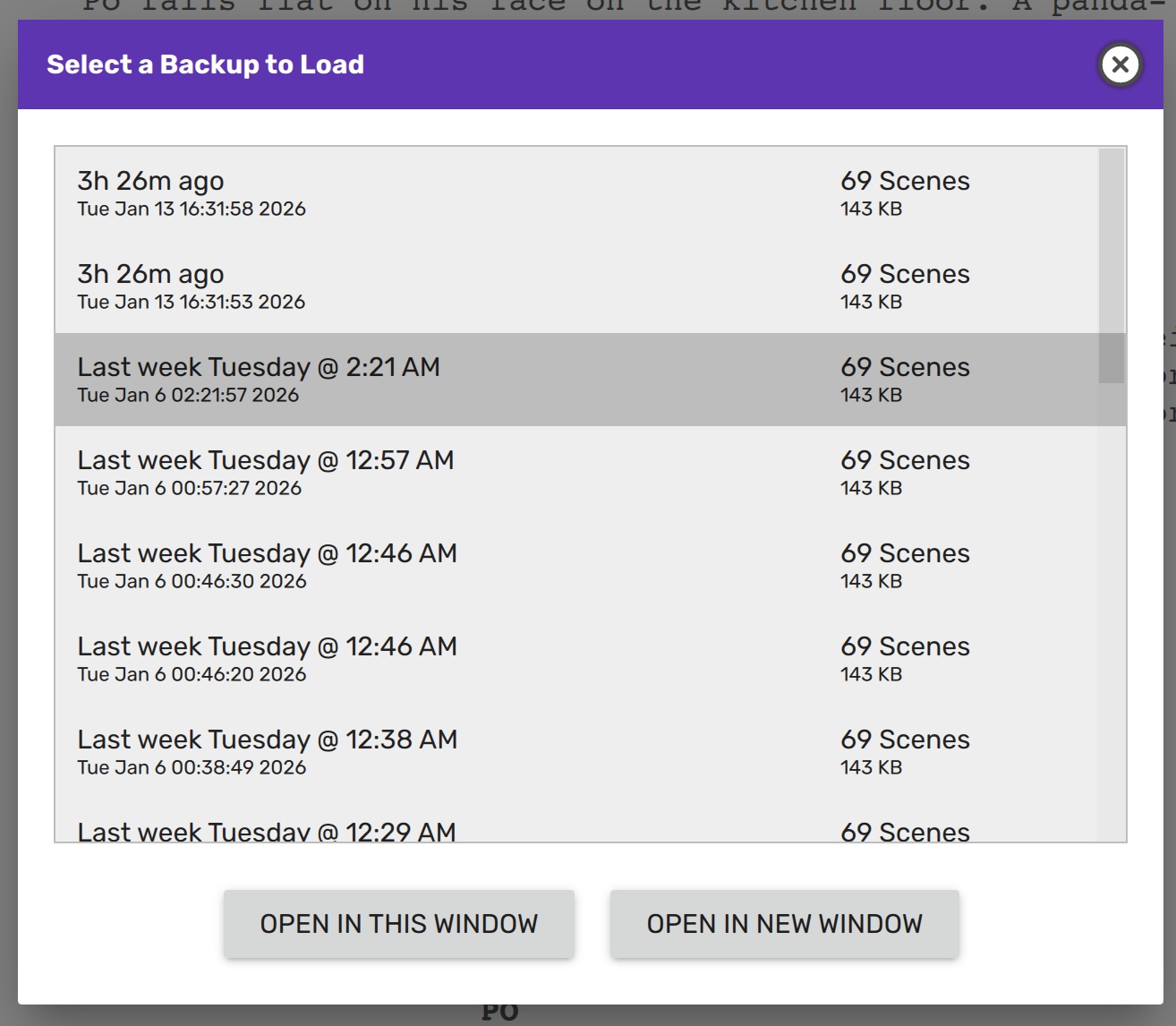 Click it to open a dialog and select a backup to load in a new or the current window.