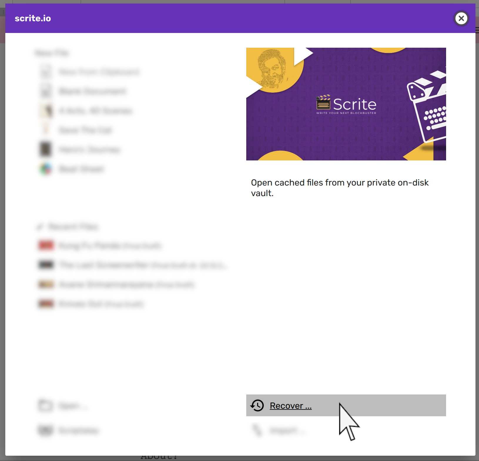 Did you ever face a situation where you wrote something, but forgot to save it? Worry not - happens to the best of writers! Scrite keeps a copy of your unsaved files in the vault from which you can recover.