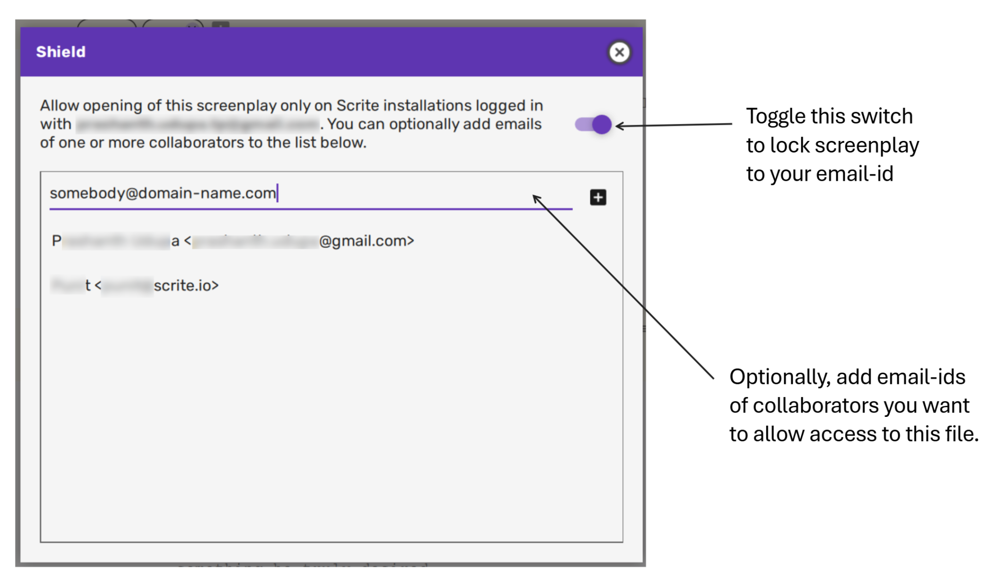 Optionally, you can add email ids of one or more collaborators who you want to hand-pick and permit opening the file. This means that the file can now be opened on devices with Scrite activated using either your email-id or any one of your collaborator’s email ids.