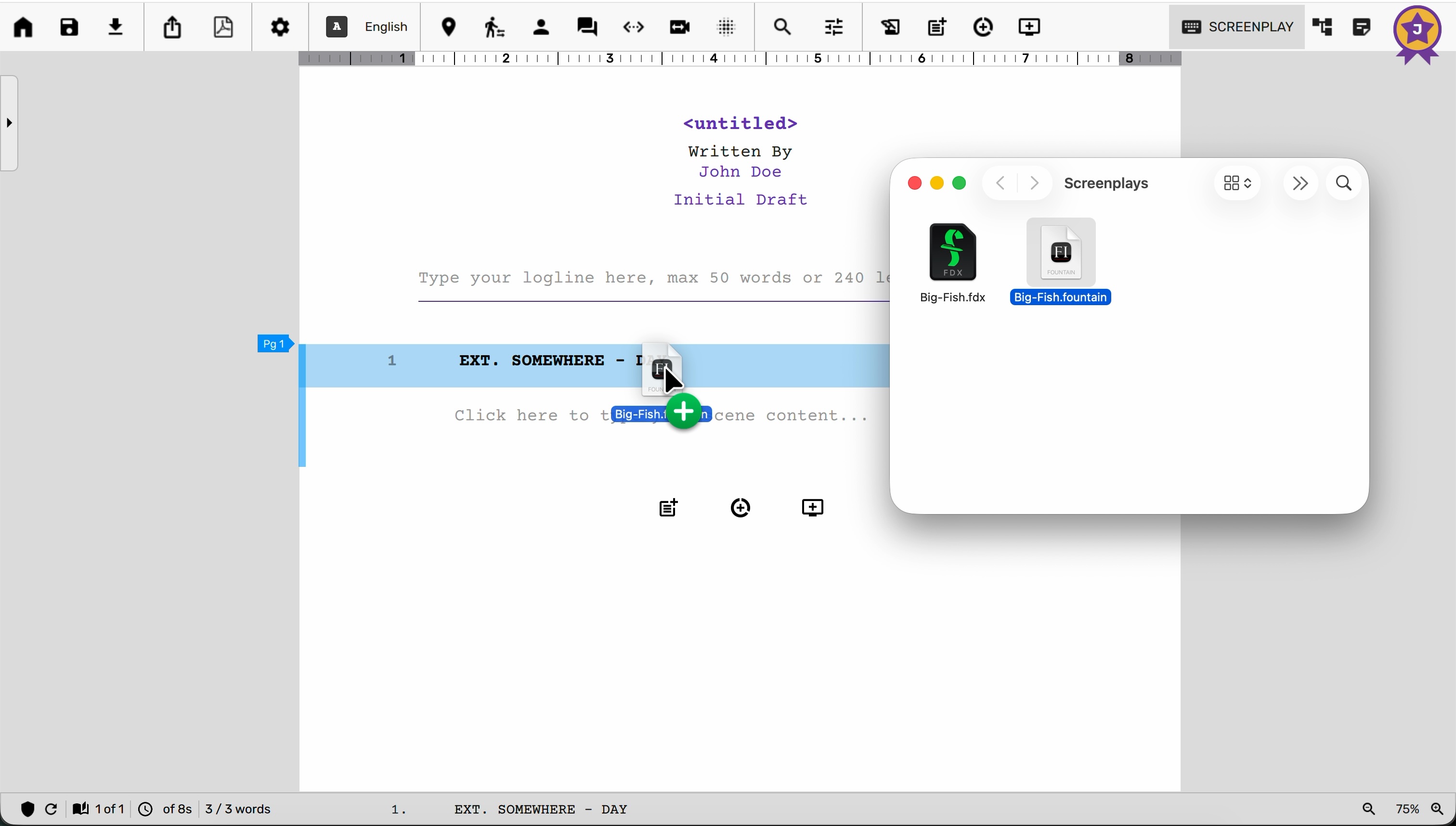 The simplest way to import a file is to simply drag and drop a file on the screenplay editor tab.