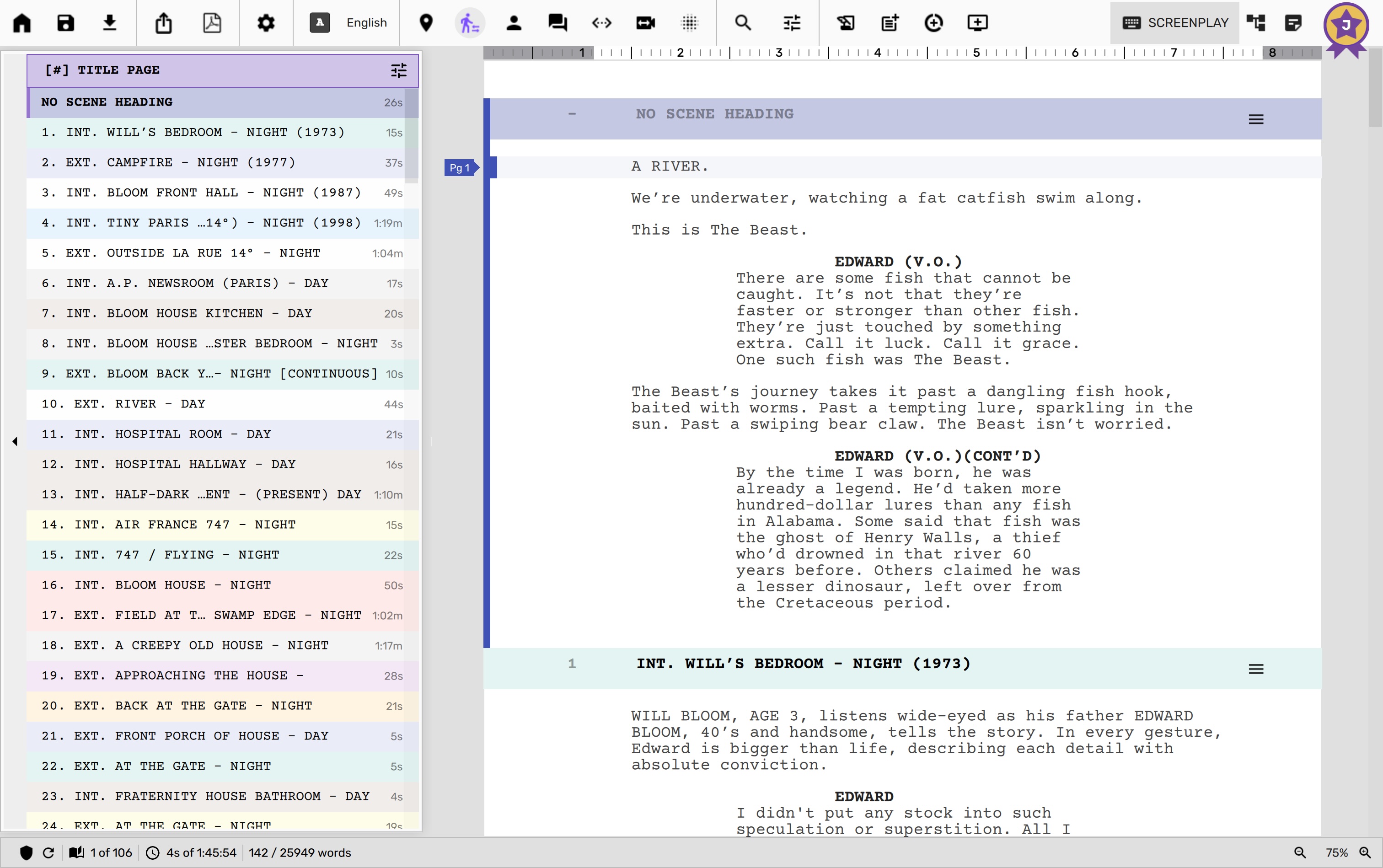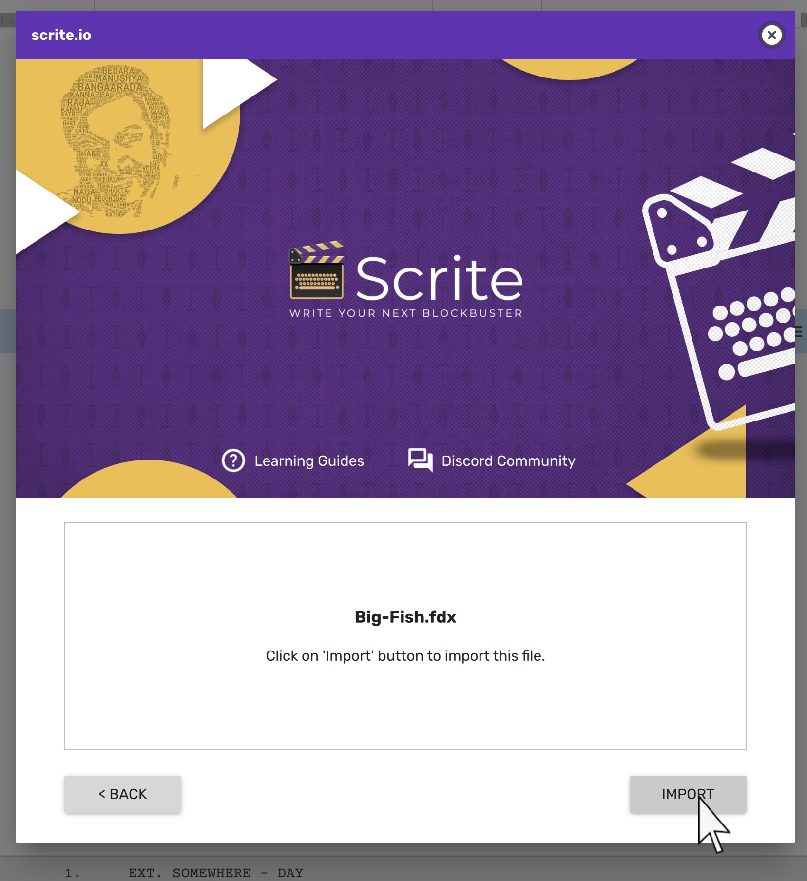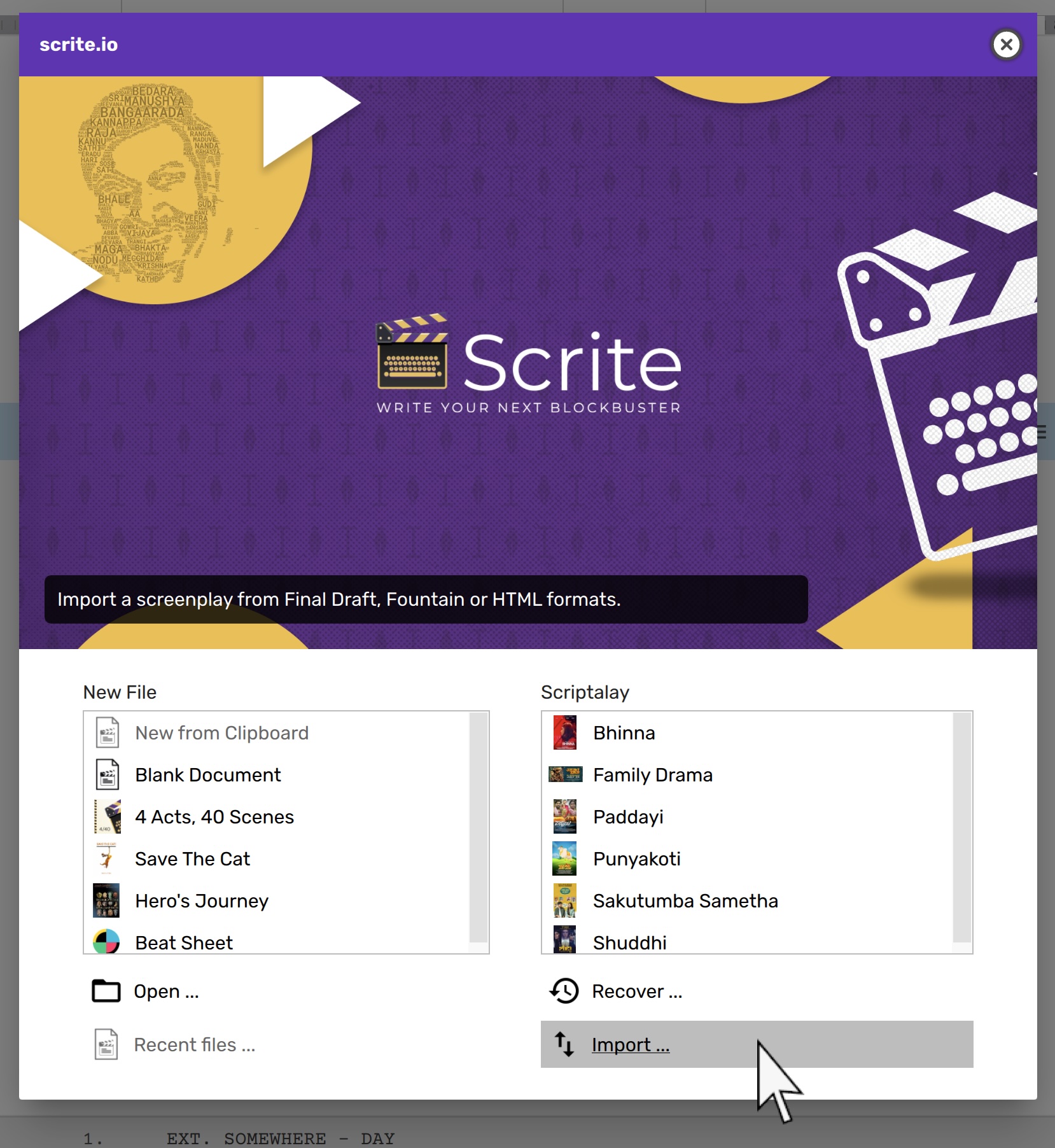 You can import screenplays from popular 3rd party formats like FDX (Final Draft 13 or prior), Fountain and Plain Text.