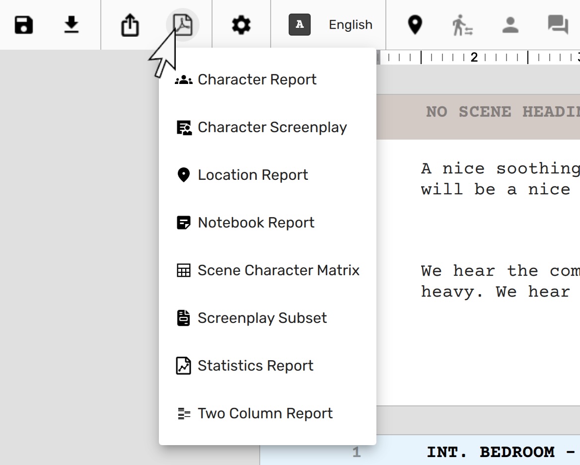 When you have a screenplay open in Scrite, click on the Report menu to get a list of report options.