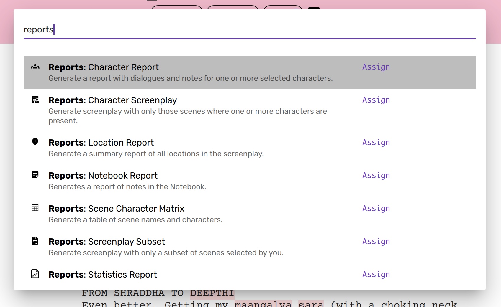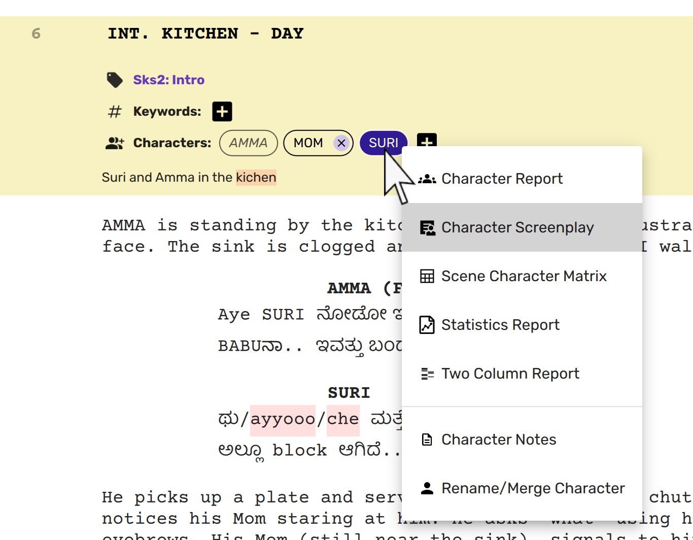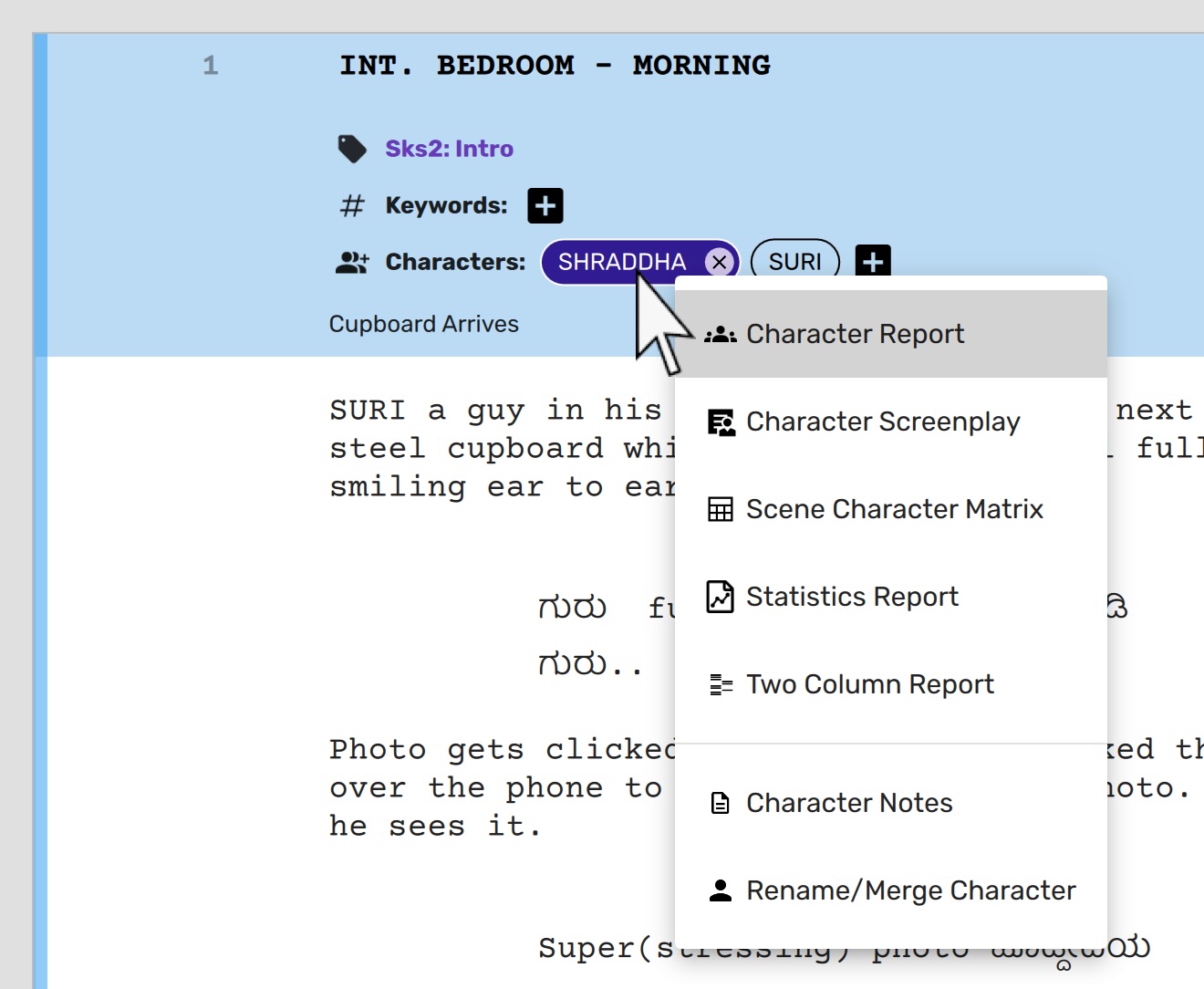- Other pages let you filter or lookup aspects of the screenplay to include in the report.