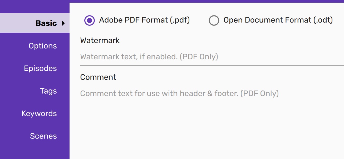 - The Basic page lets you select export file type (PDF vs ODT), and specify watermark and comment texts for use in PDF.