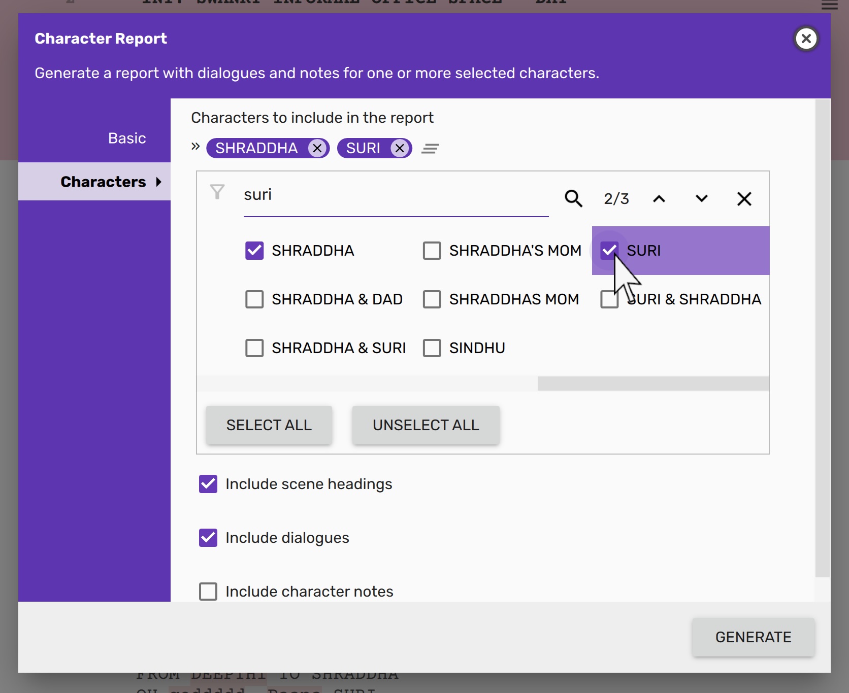 Upon invoking this report in the menu or command center, you can switch to the Characters tab to select one or more characters whose dialogues you want included in the report.