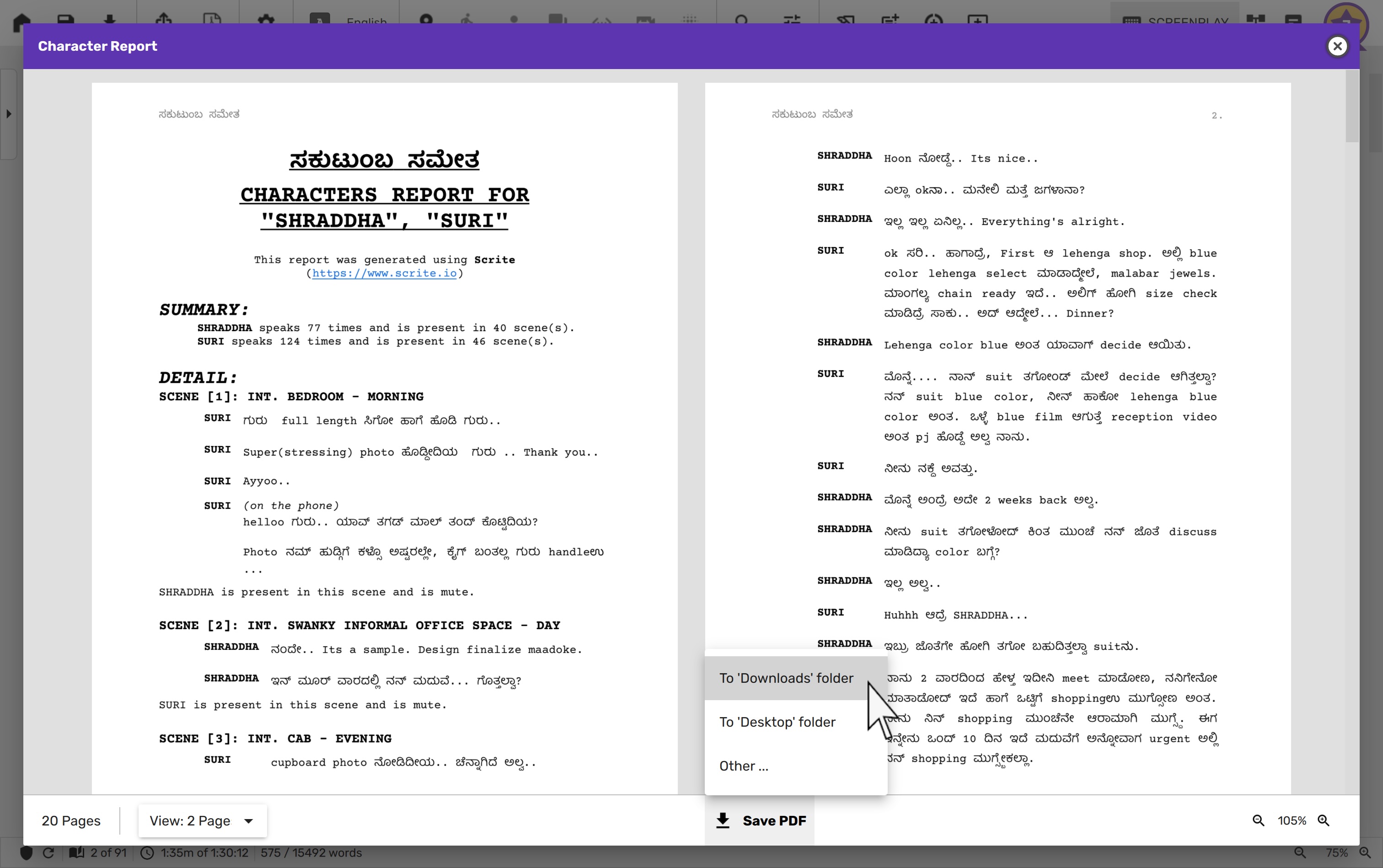 Creates a PDF/ODT that lists every scene in which the chosen characters appear, with their dialogue highlighted in yellow. Great for quick reference or for sending a focused script to collaborators.