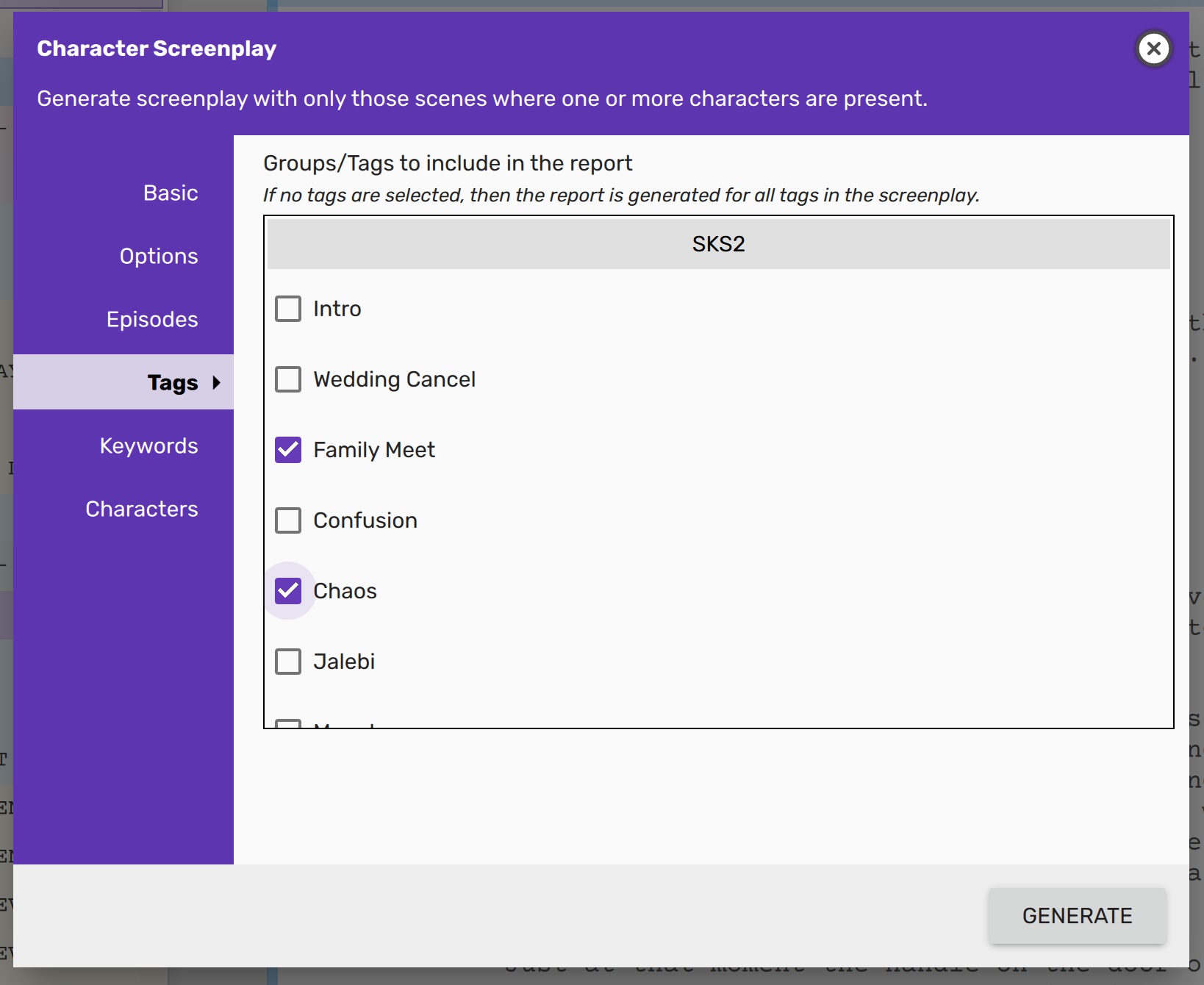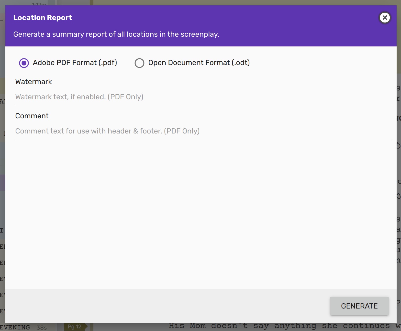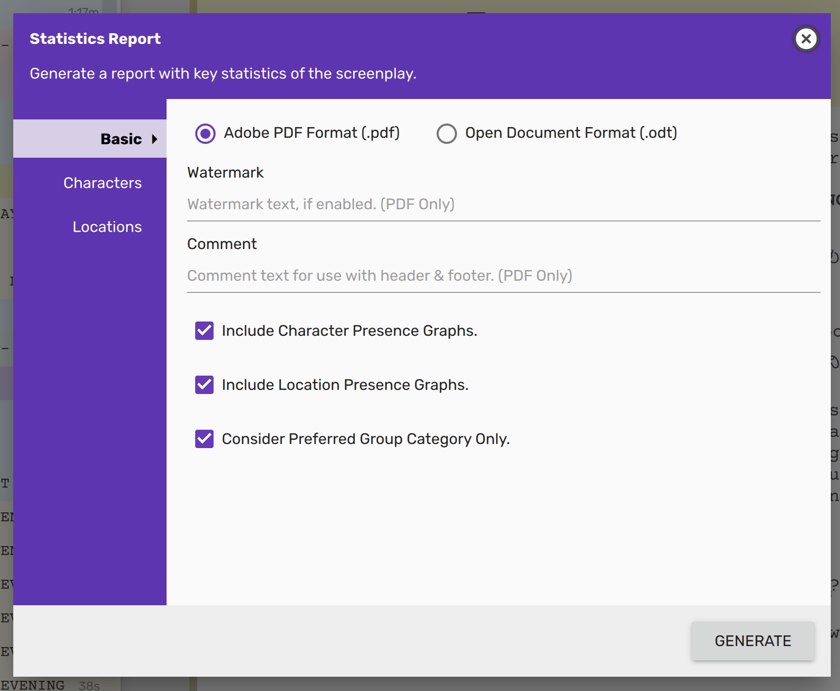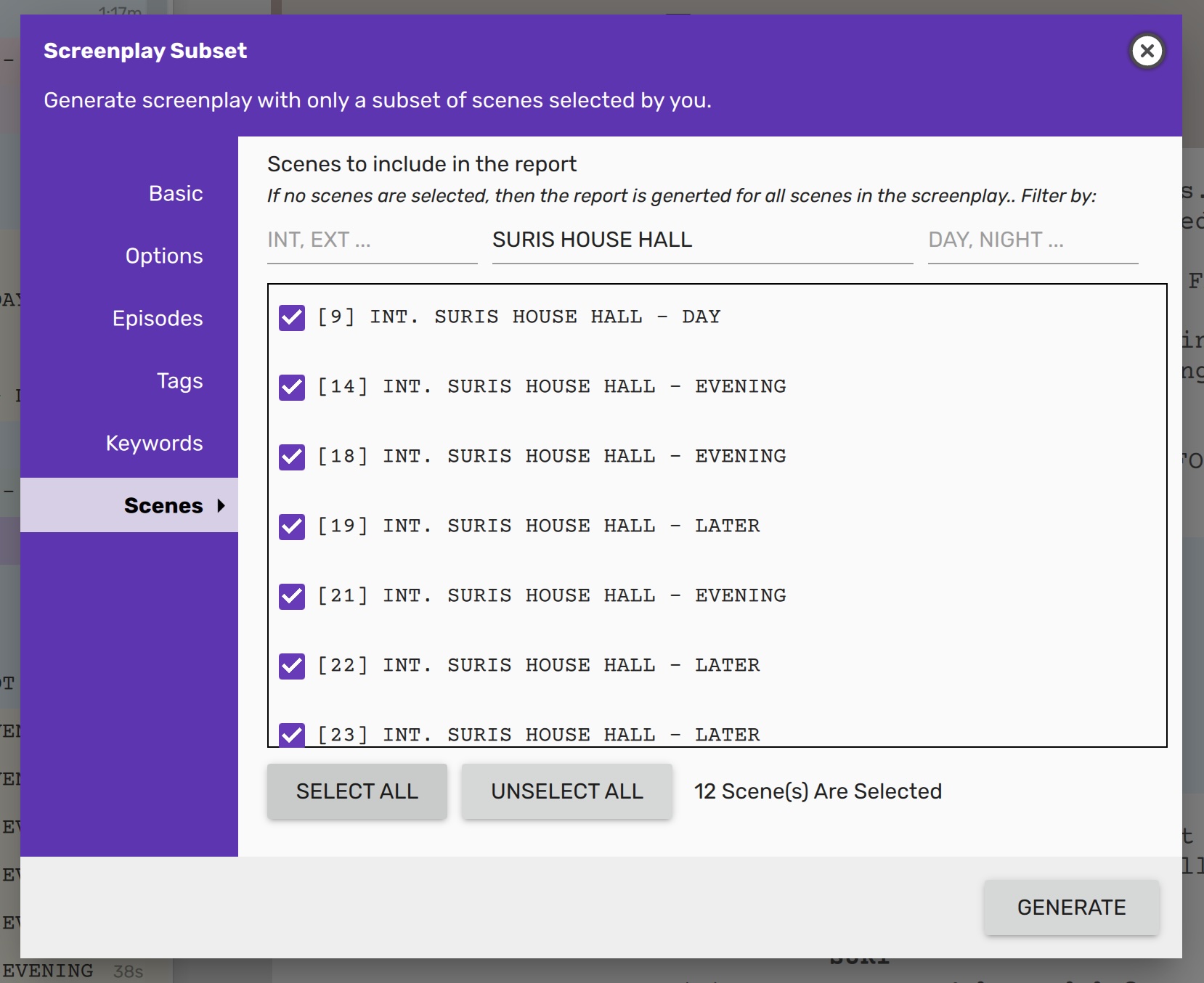 Then hit the Generate button to generate a PDF of just the selected scenes.