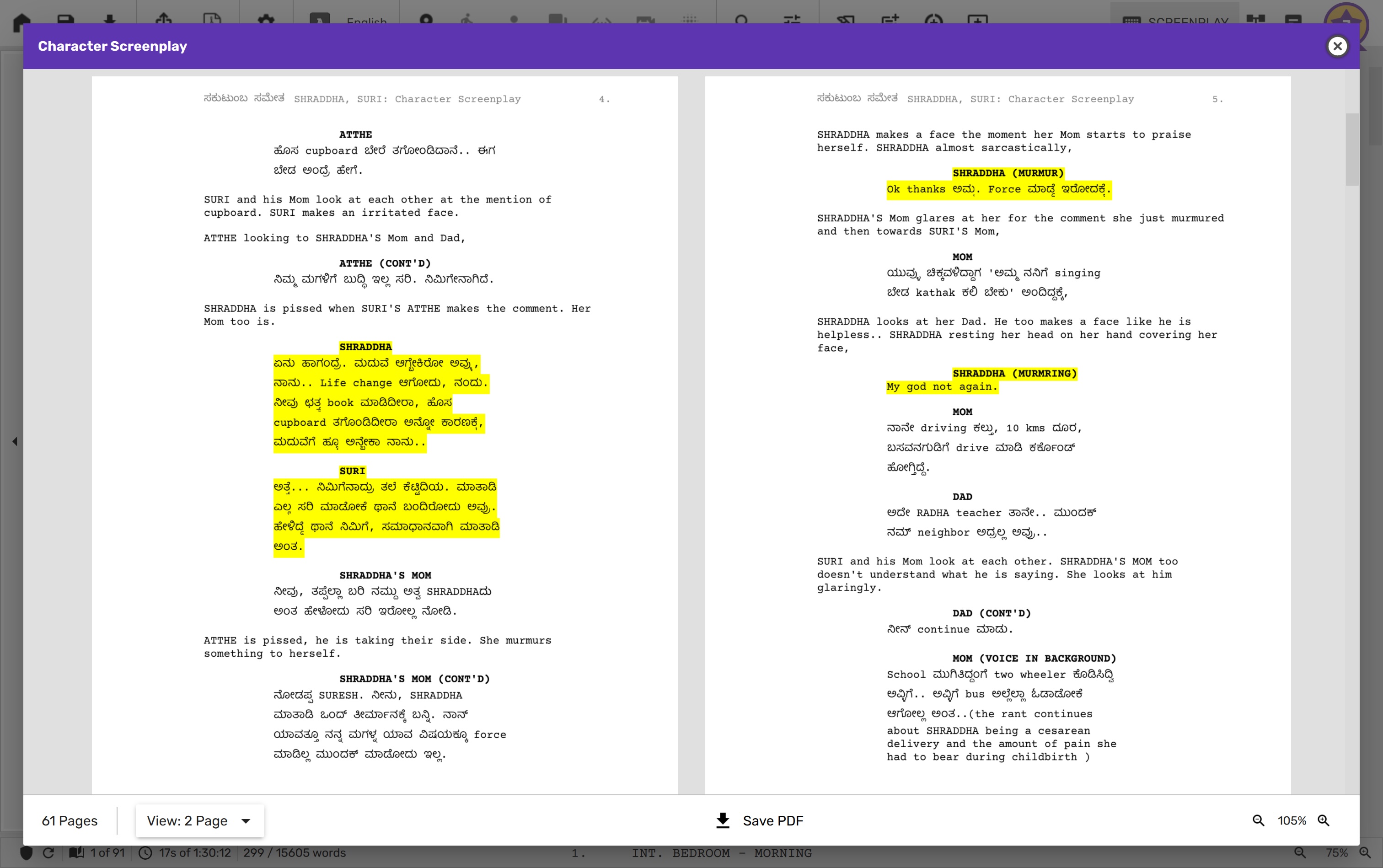 - Character Screenplay – an extract of scenes in which the chosen characters appear, with their dialogue highlighted in yellow.