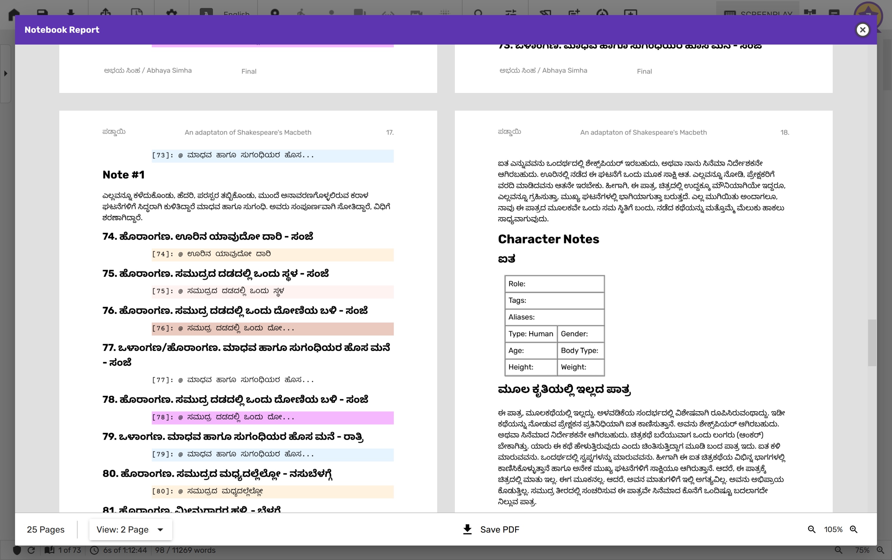 Exports a PDF/ODT that compiles all notes from the Notebook, including story, scene, and character annotations. Ideal for keeping a single source of truth for all research and ideas.