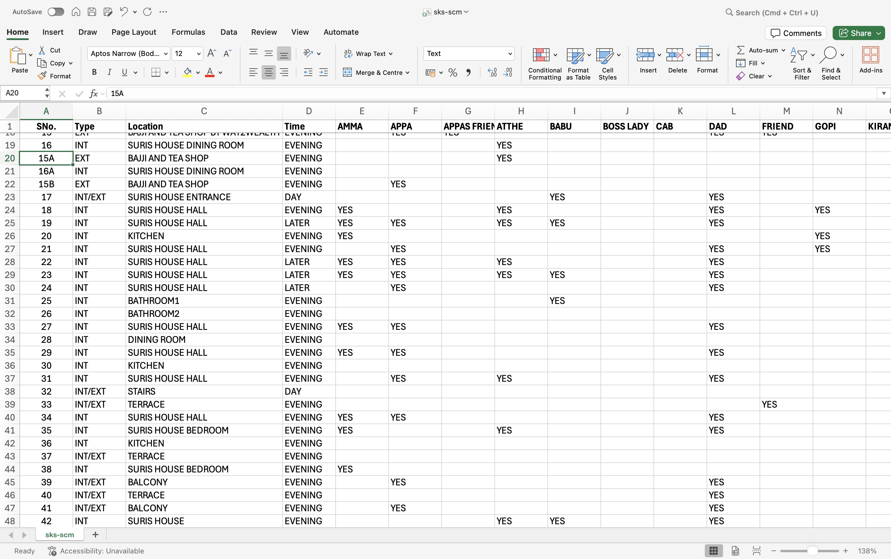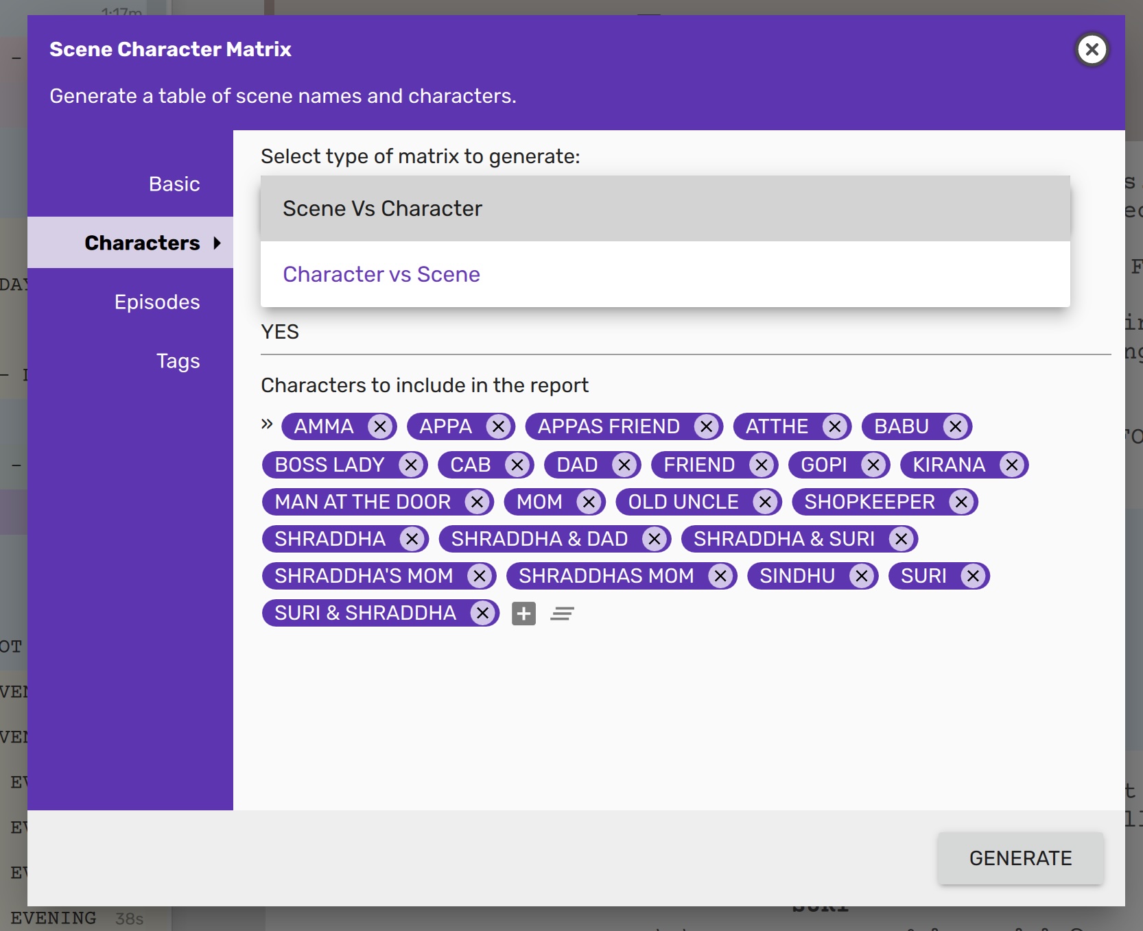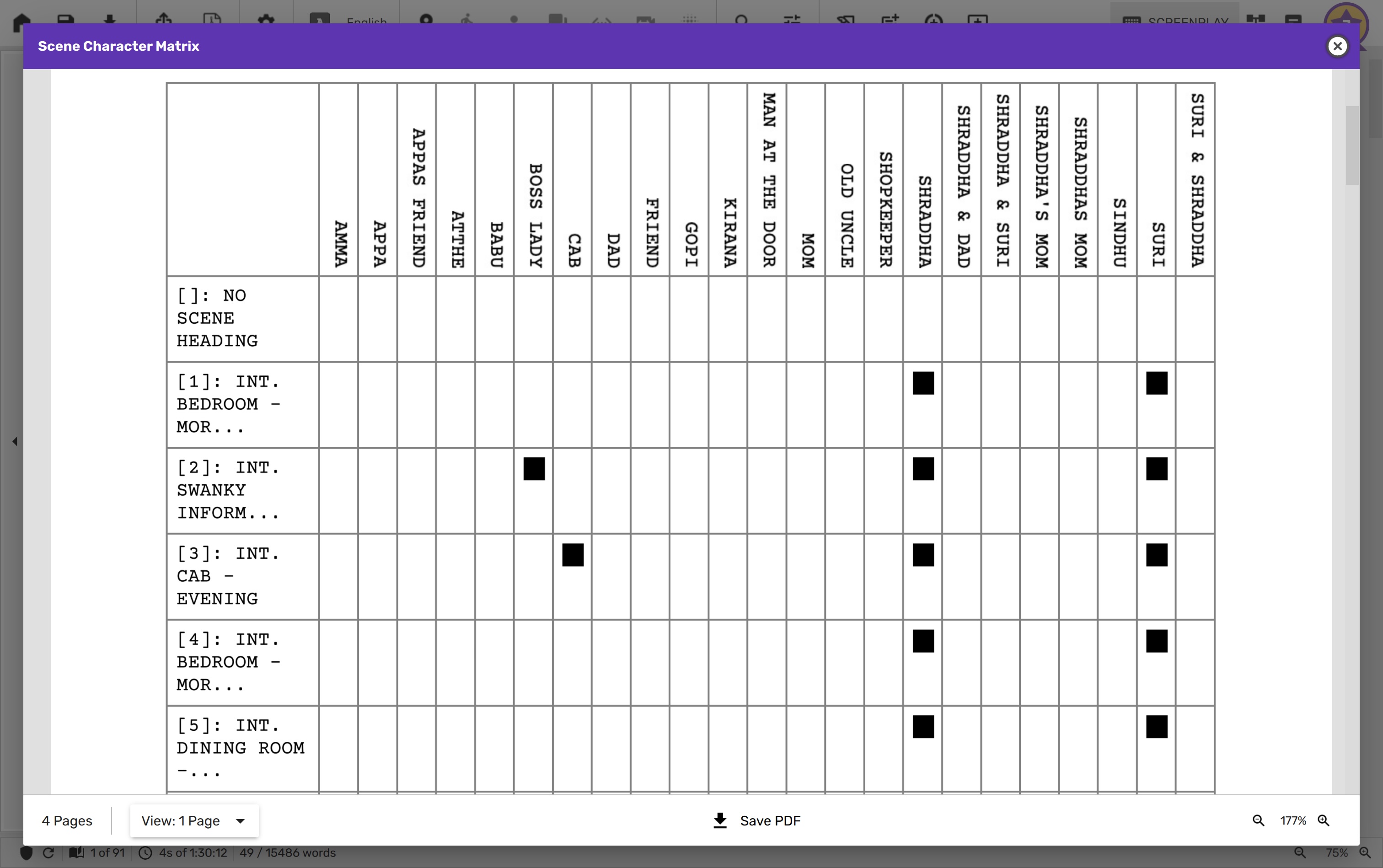 Produces a PDF or CSV table that shows which characters appear in each scene. Useful for tracking character presence and balancing scenes, and during production planning.