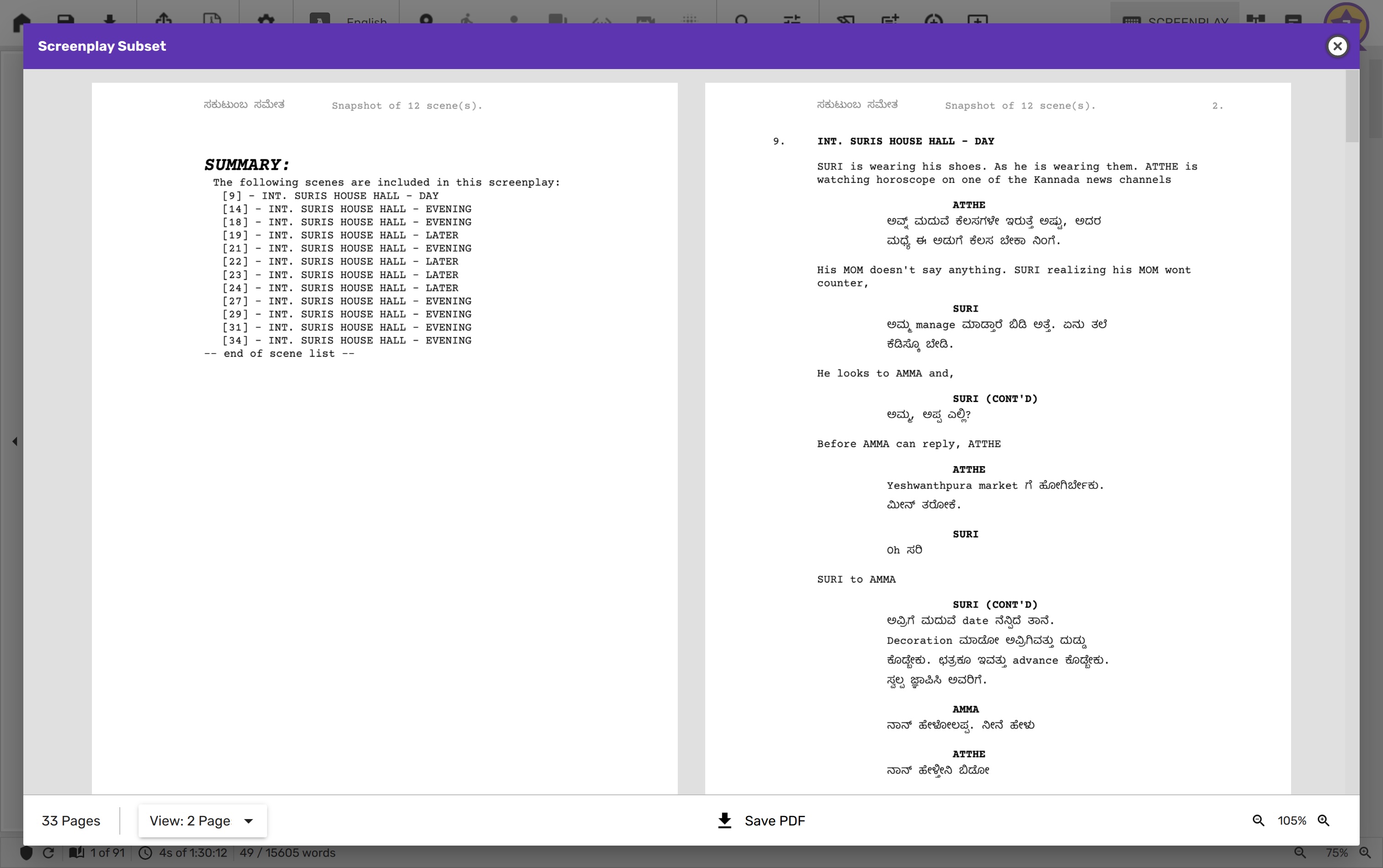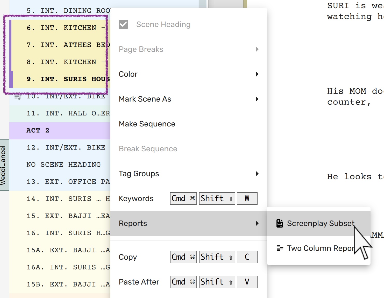 - Screenplay Subset – an extract of a manually selected subset of scenes or of scenes that match specific keywords, beats, or episodes.
