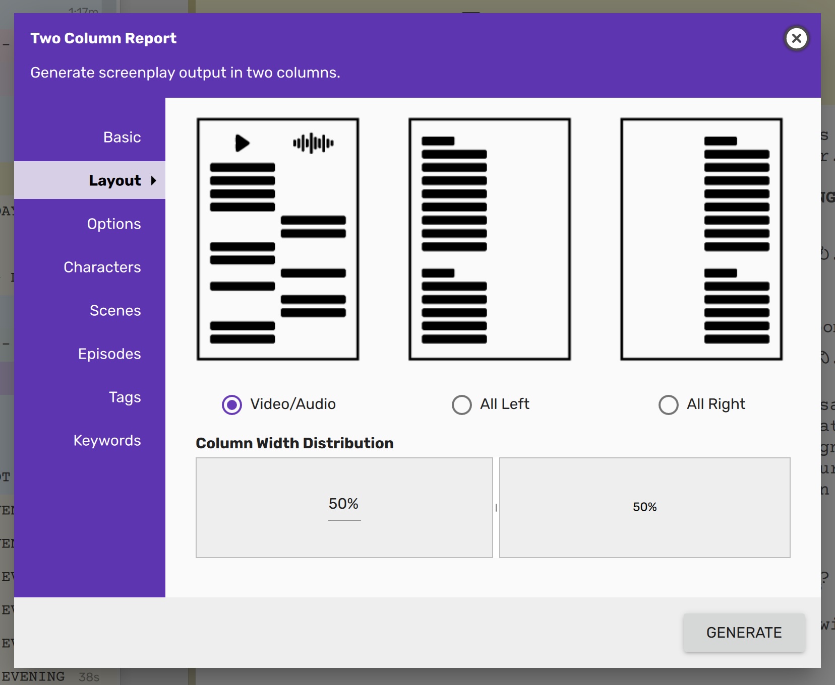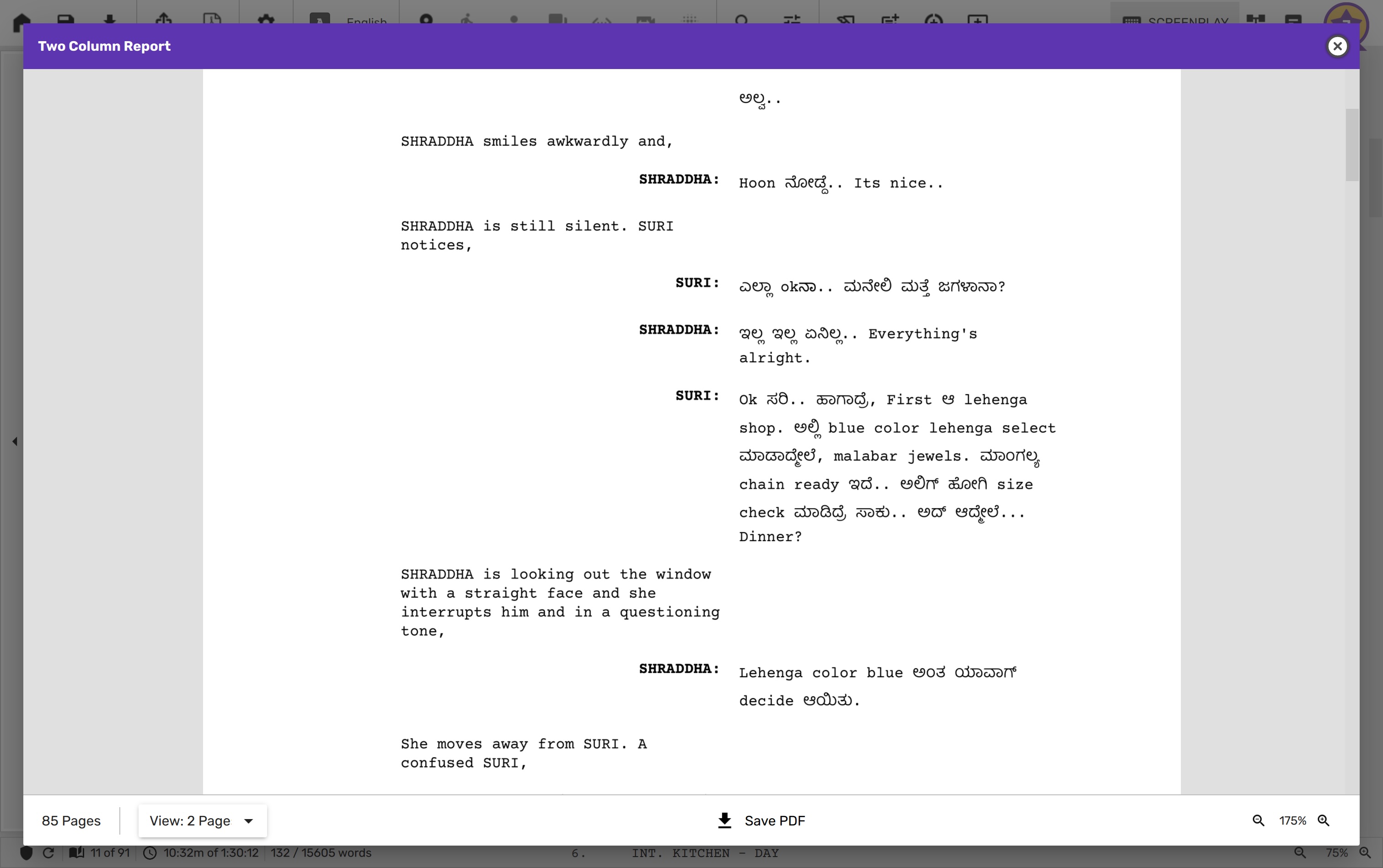 Upon generating the report you will notice that the entire screenplay is presented in a two column format. All the visuals in the column on the left, with the dialogues on the right column.