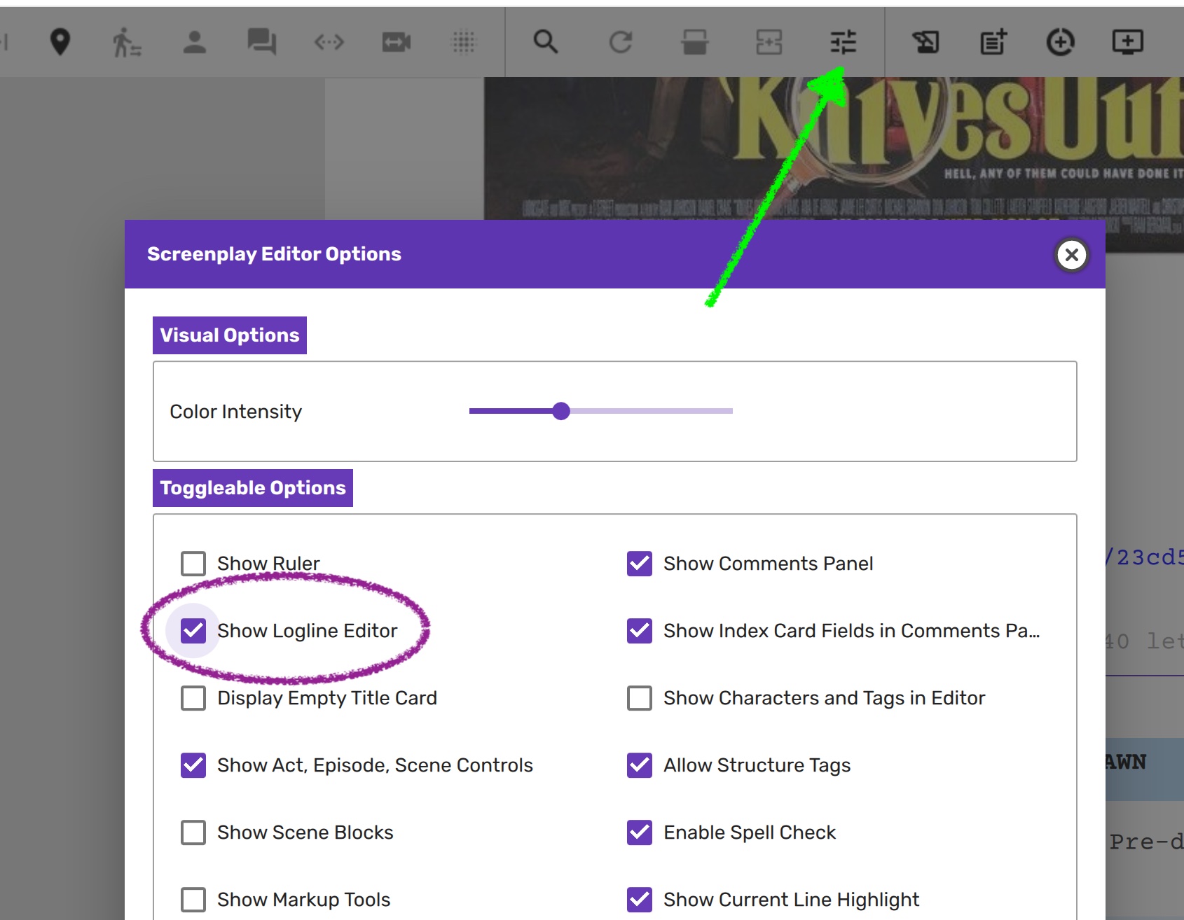 If you want to capture the logline of your screenplay in Scrite, you can toggle the logline editor in the Screenplay Editor Options Dialog.