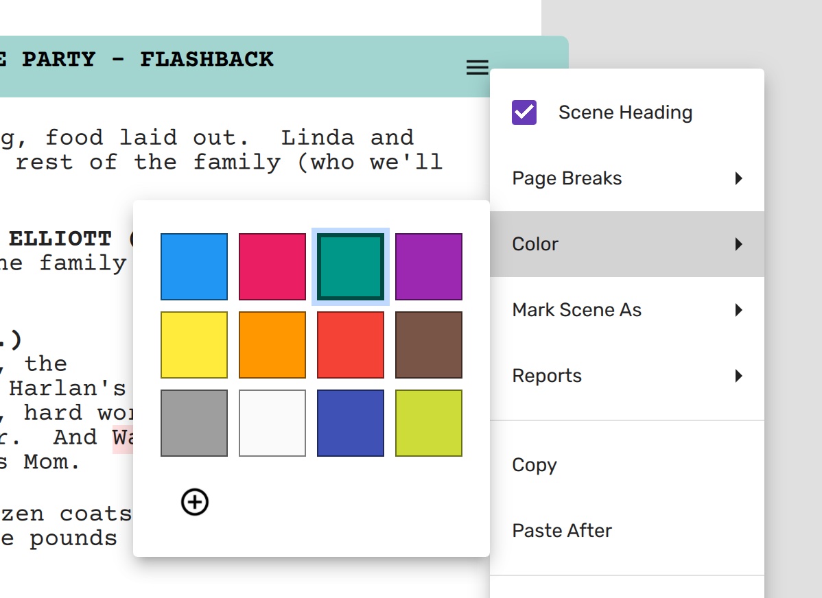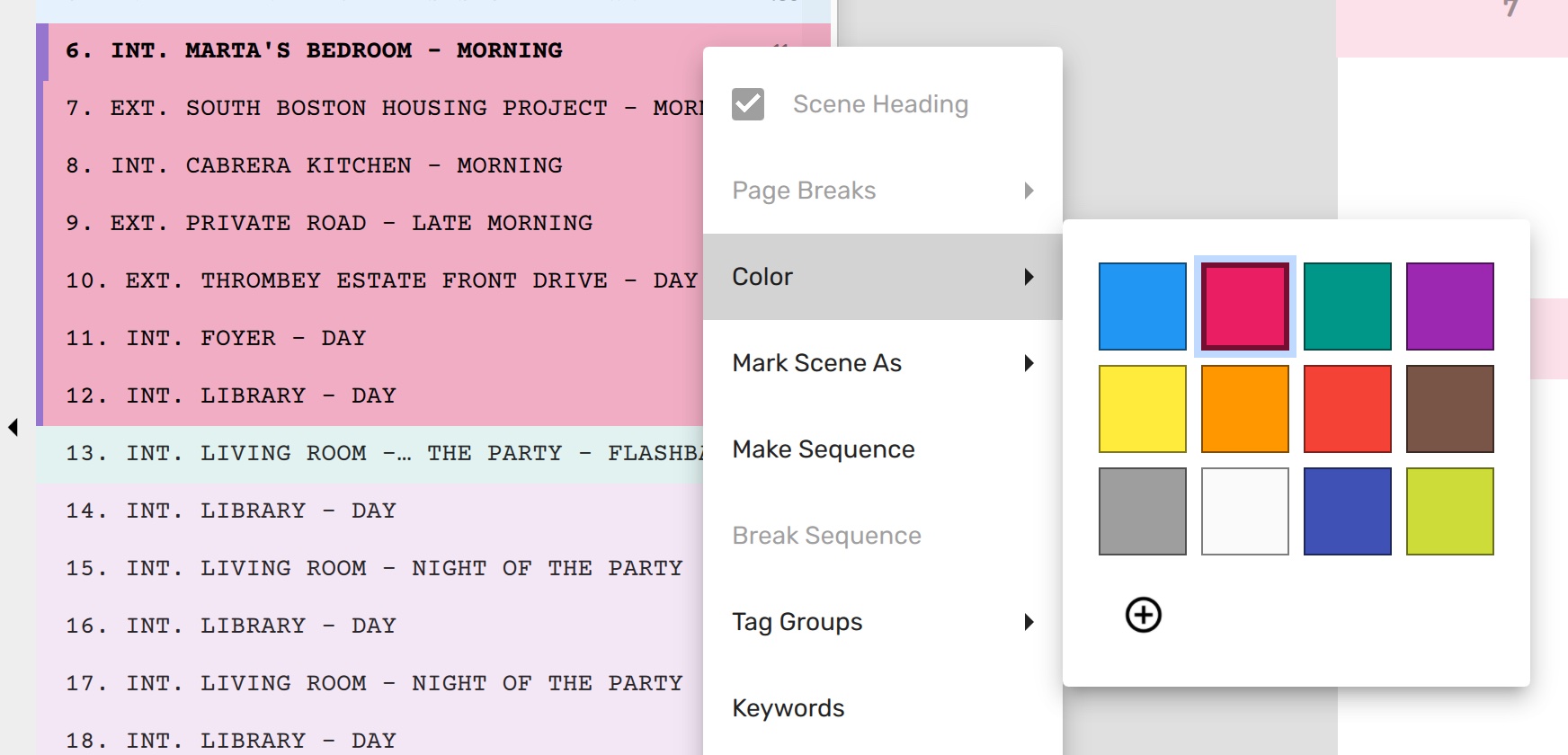 Infact, you can also open the scene options menu in the screenplay editor to assign scene color for a specific scene.