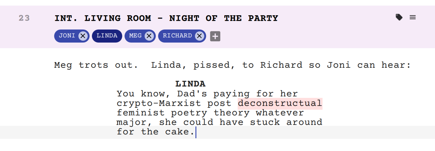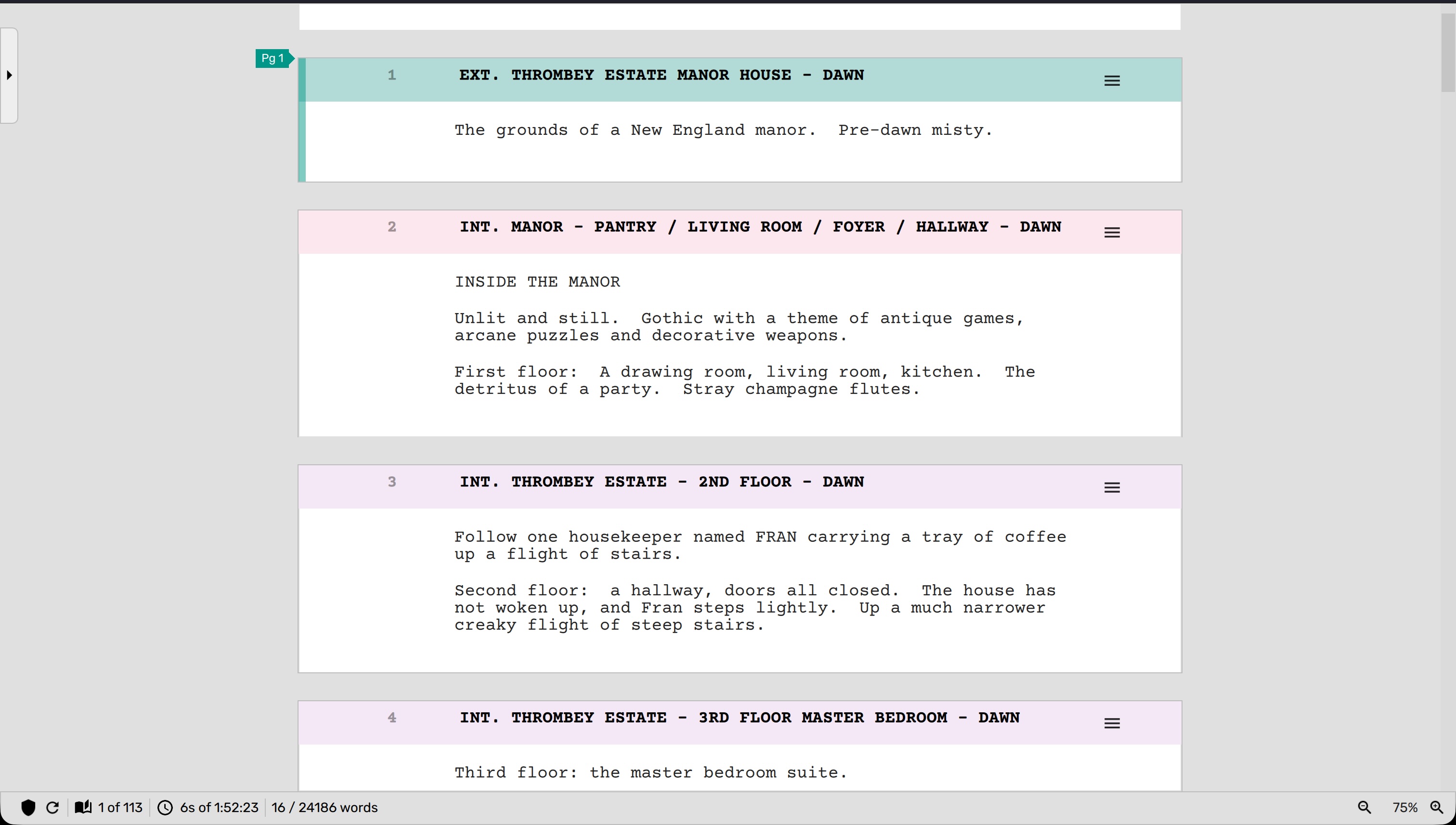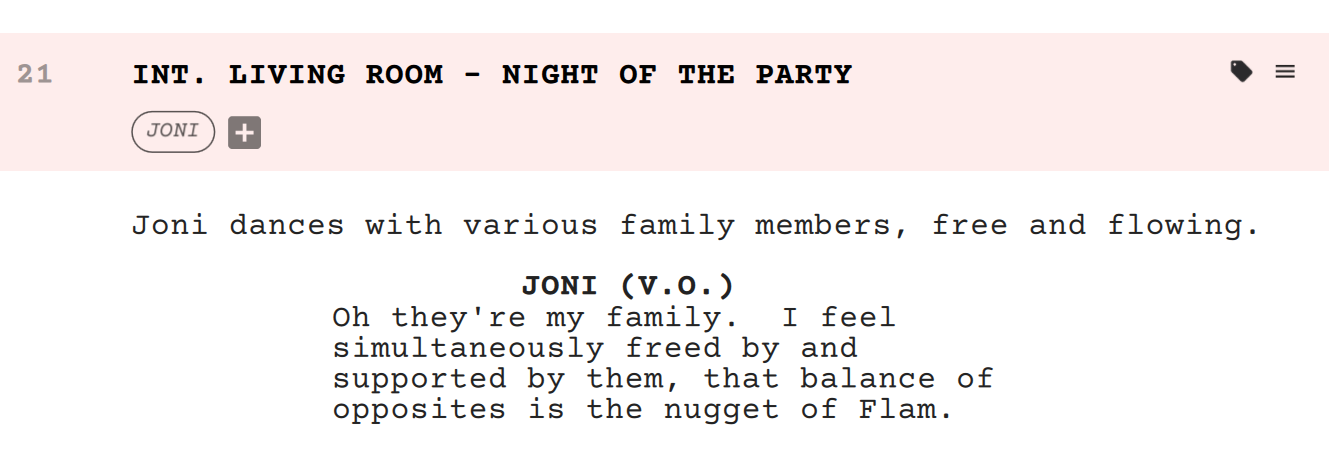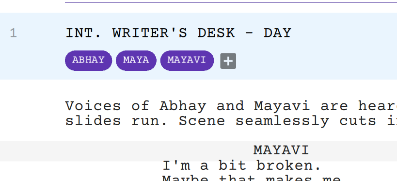 writing screenplays. Each scene is a distint block of text, even if they show up