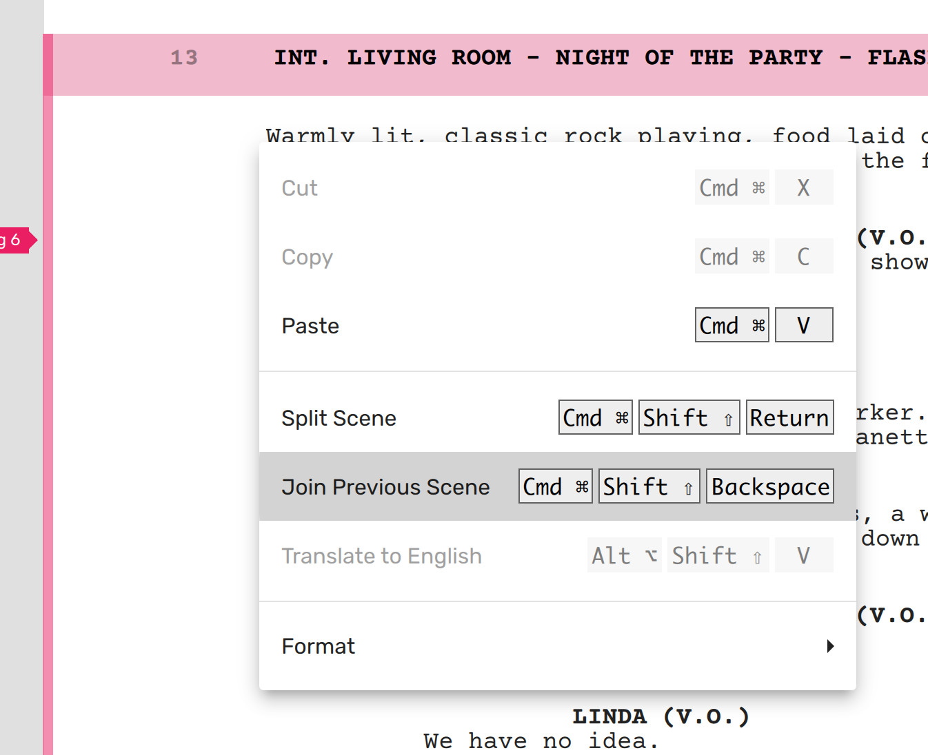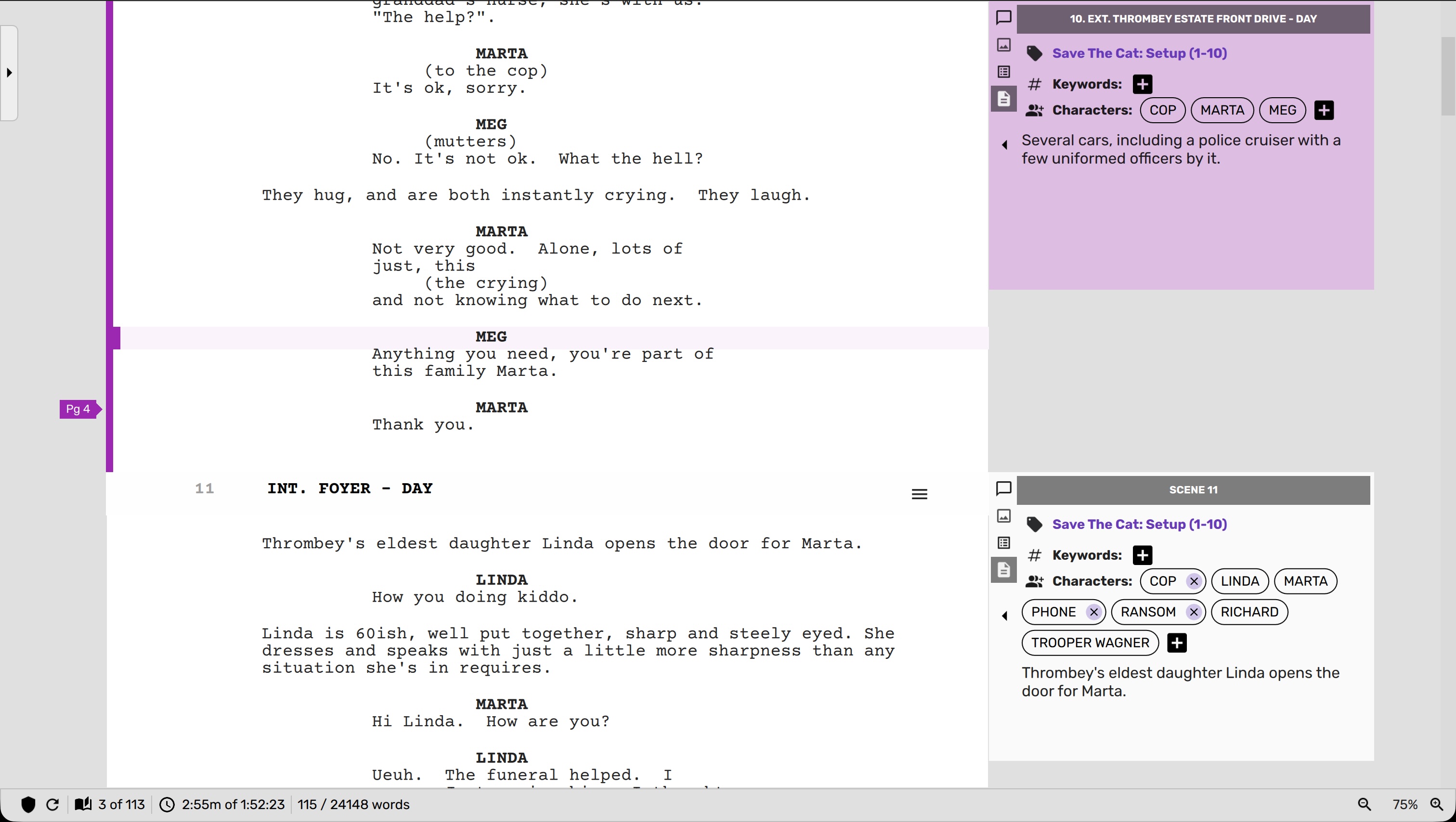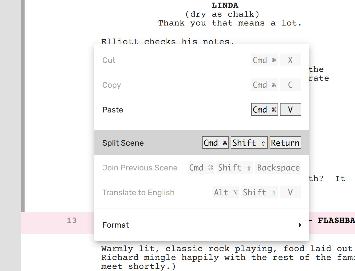writing screenplays. Each scene is a distint block of text, even if they show up