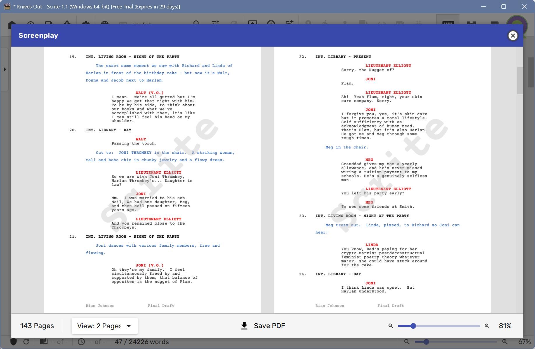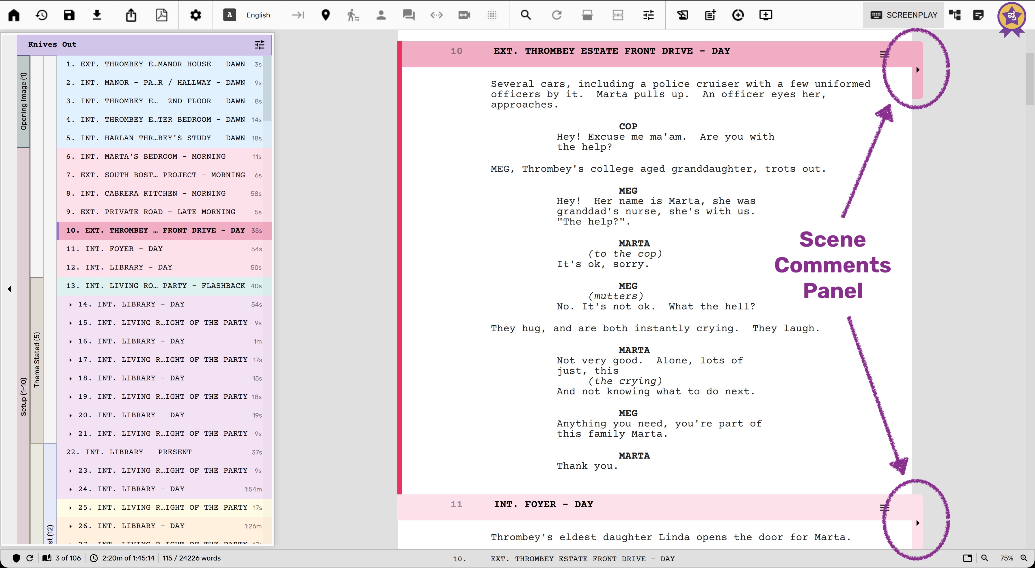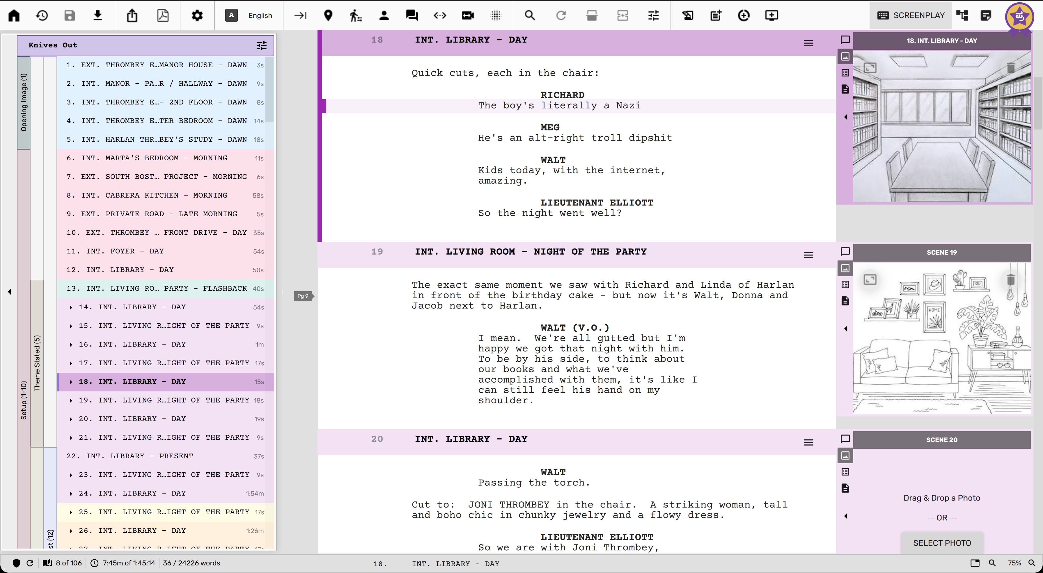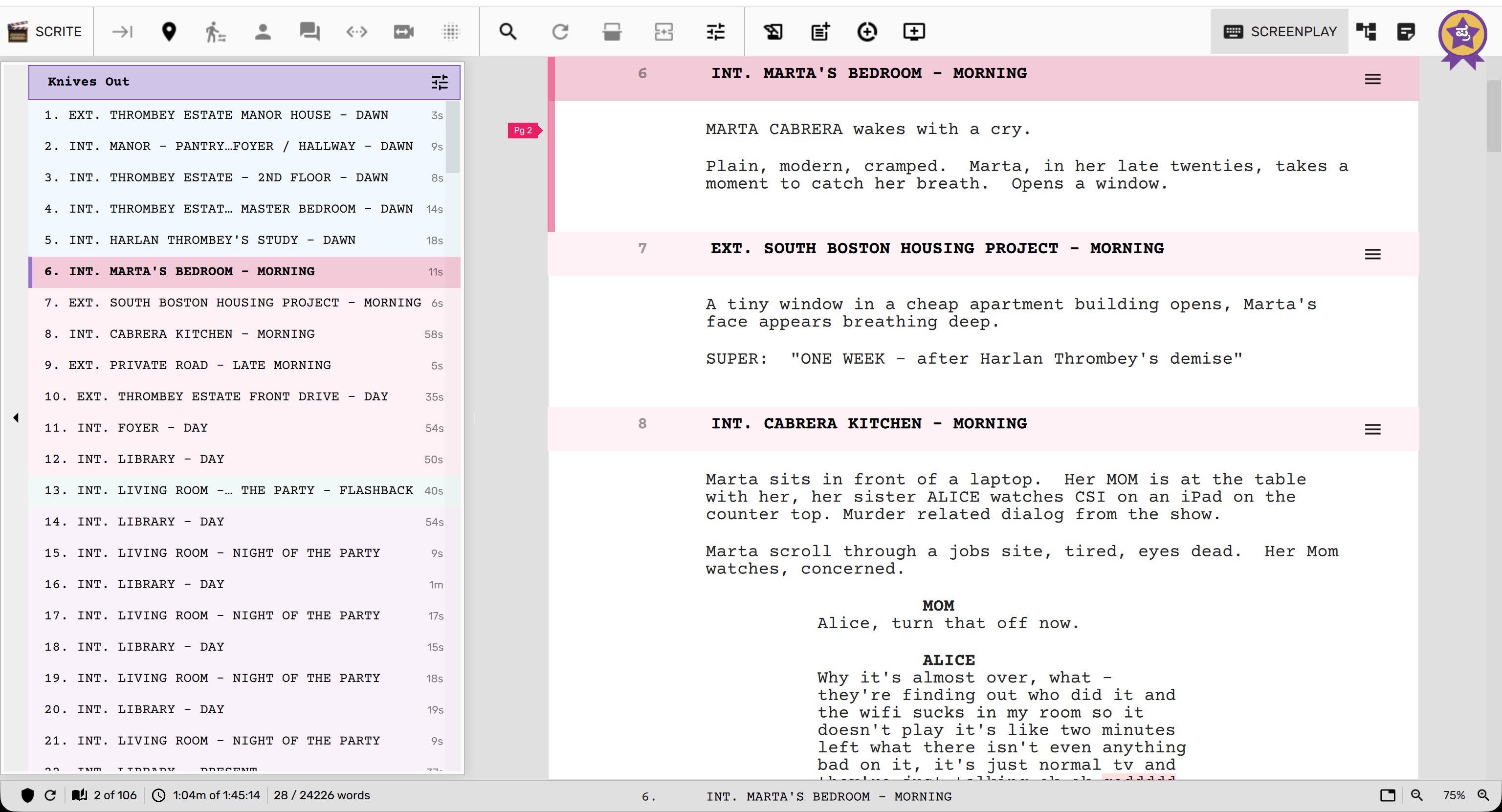 The screenplay shown in screenshots are from the 2019 film Knives Out. The original screenplay can be downloaded from here and all rights for the screenplay rests with its owners. We are using the screenplay only for explaining features in the product.