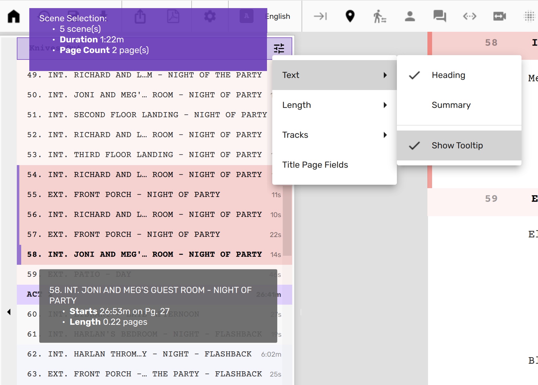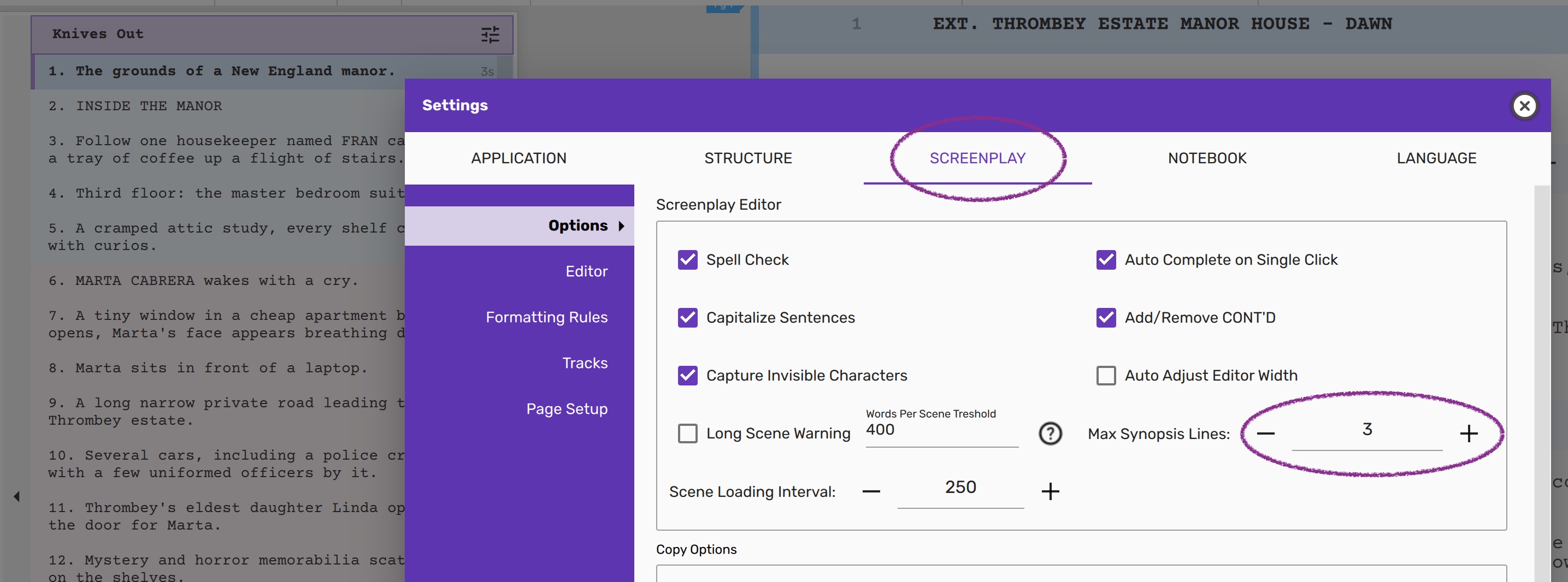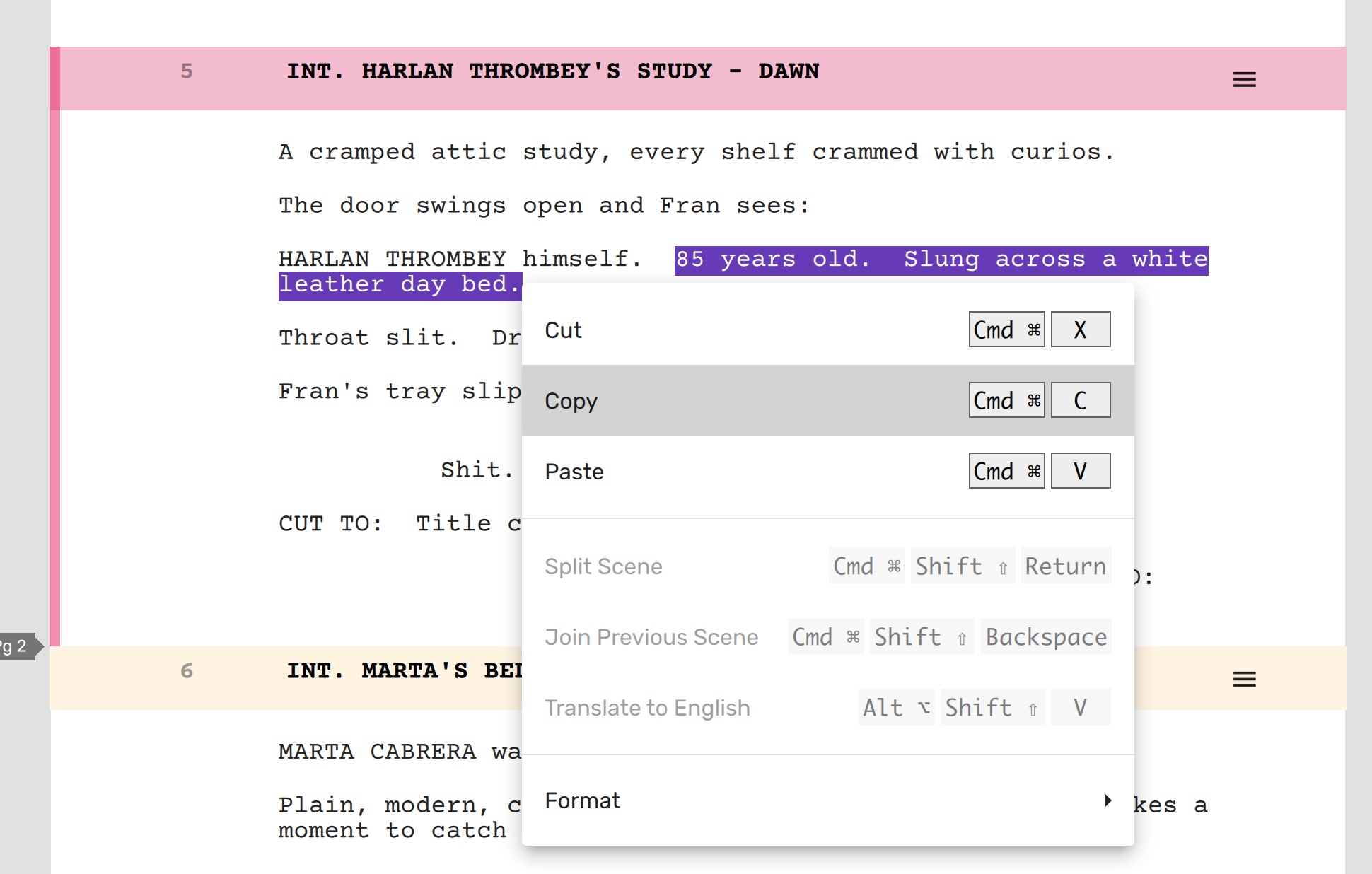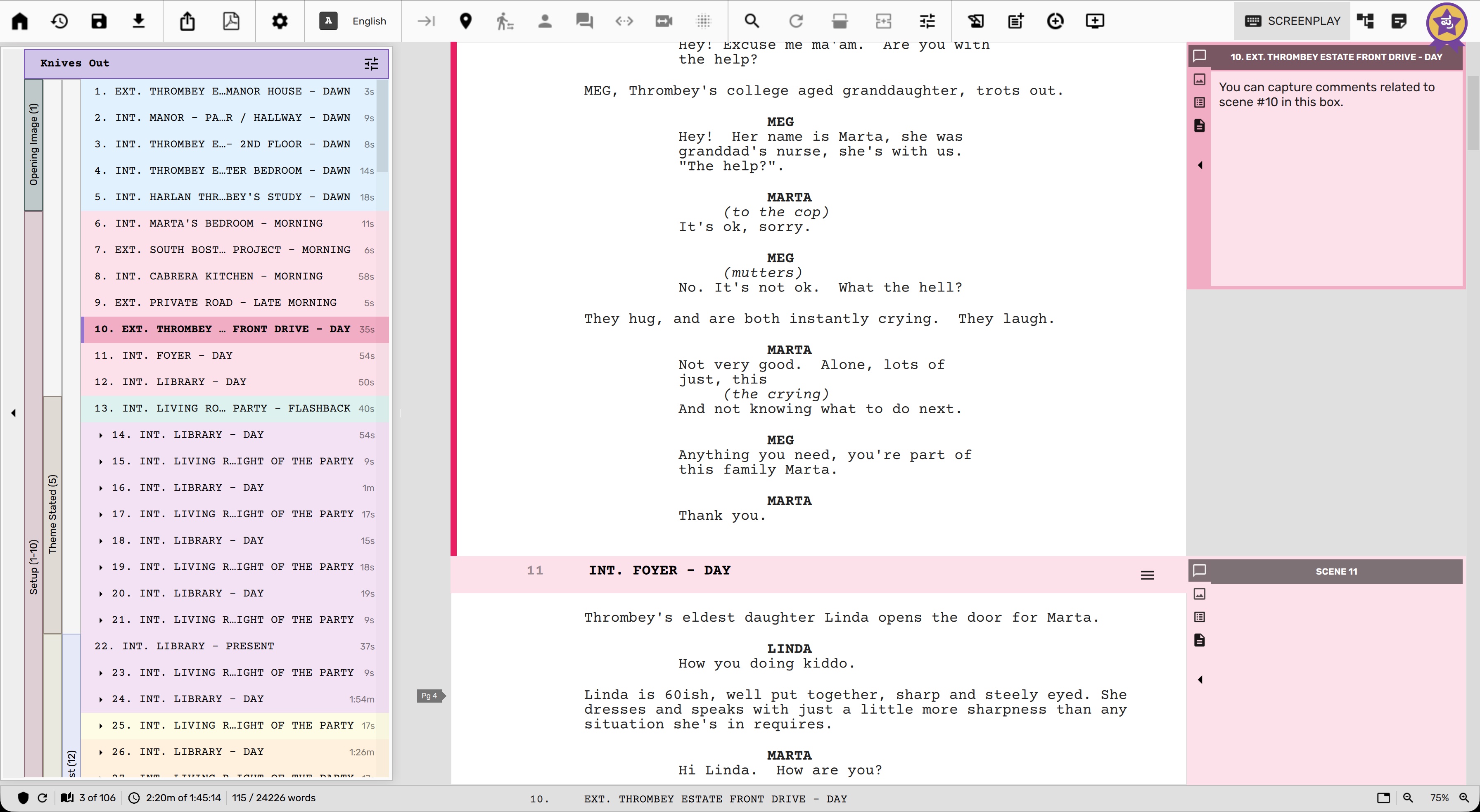 The screenplay shown in screenshots are from the 2019 film Knives Out. The original screenplay can be downloaded from here and all rights for the screenplay rests with its owners. We are using the screenplay only for explaining features in the product.
