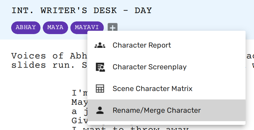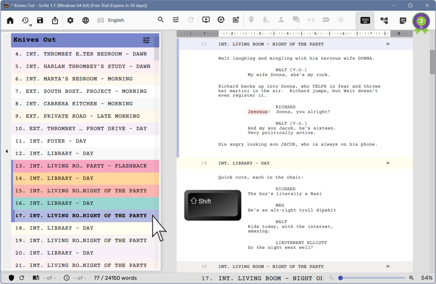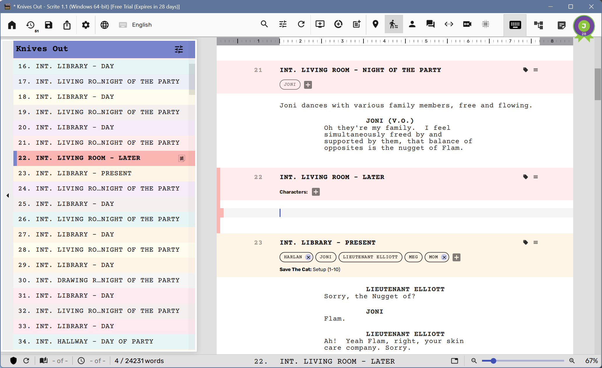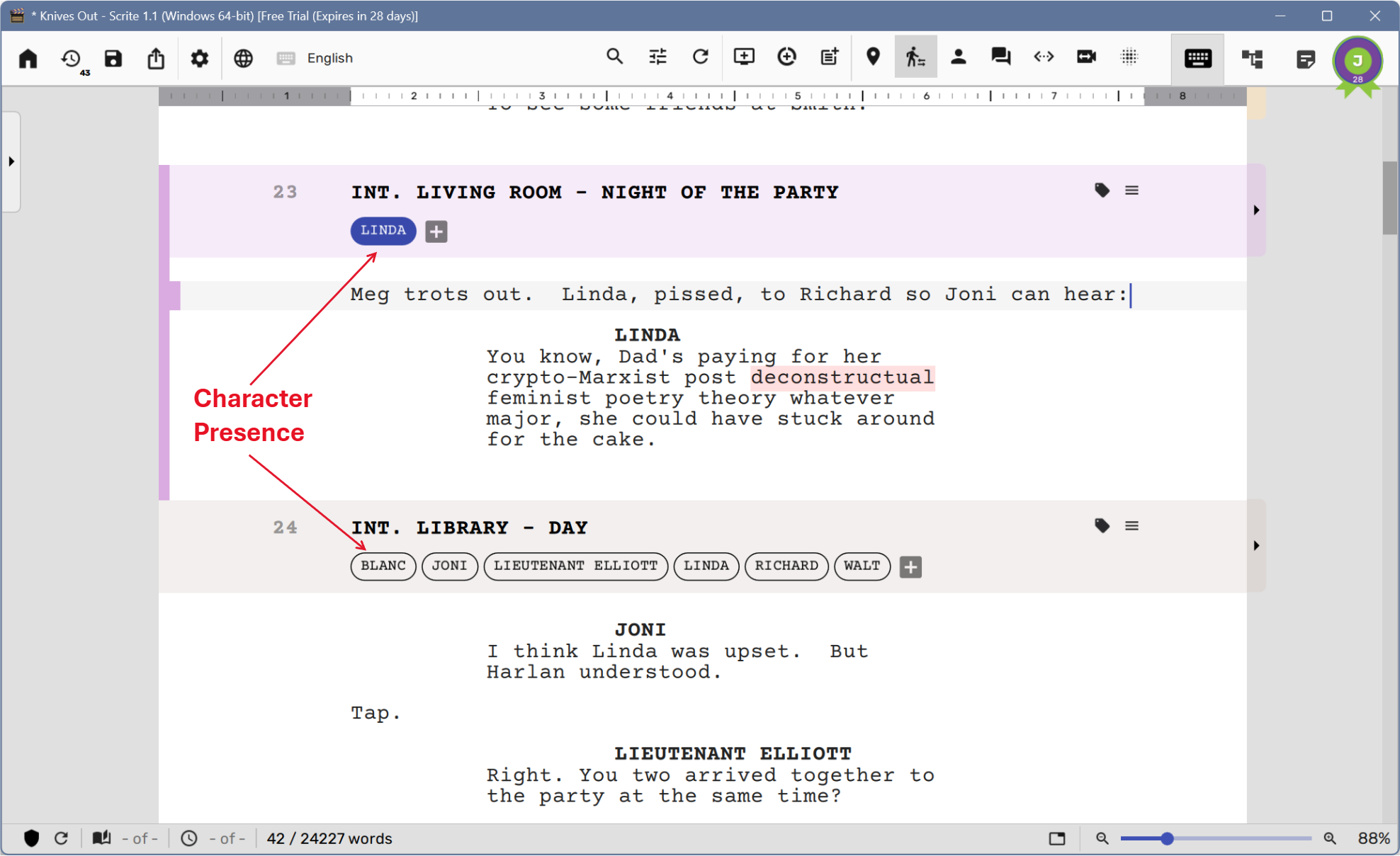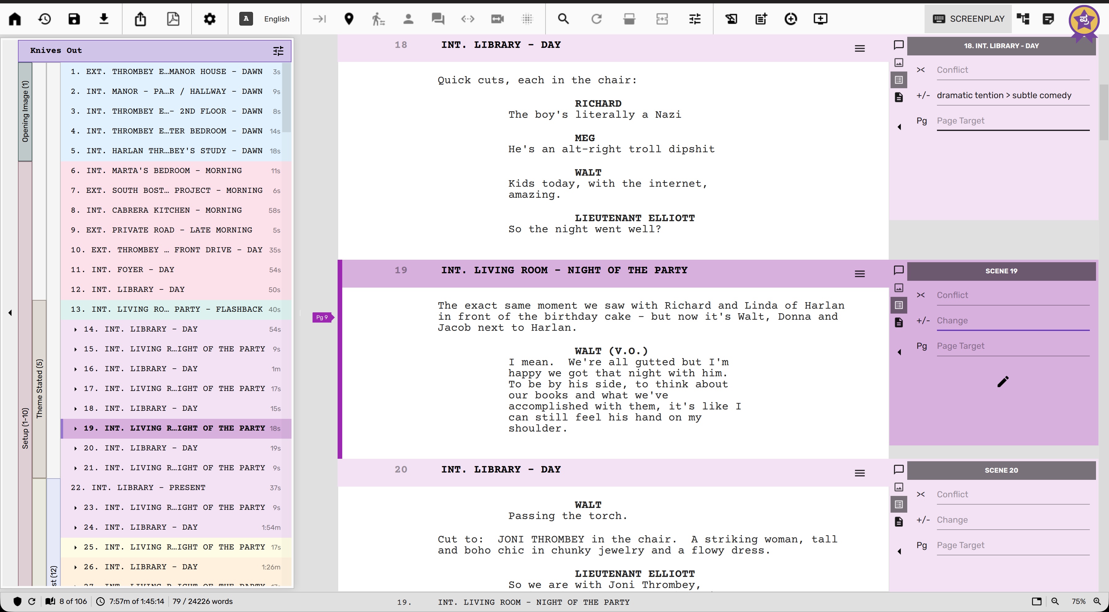 The screenplay shown in screenshots are from the 2019 film Knives Out. The original screenplay can be downloaded from here and all rights for the screenplay rests with its owners. We are using the screenplay only for explaining features in the product.