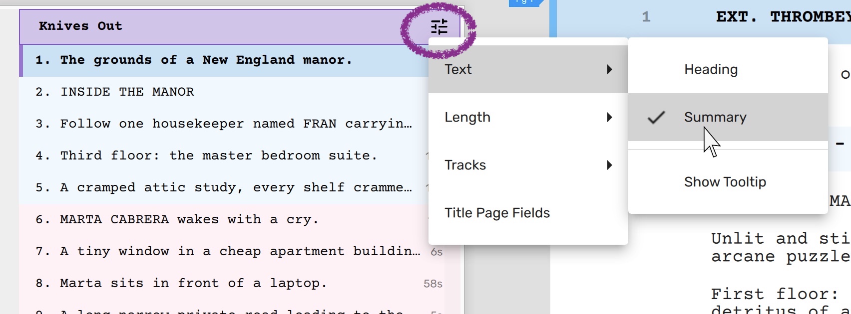 By default the Scene List Panel shows scene heading for each scene in a list view. You can, however, configure the scene list panel to show scene synopsis or summary instead.