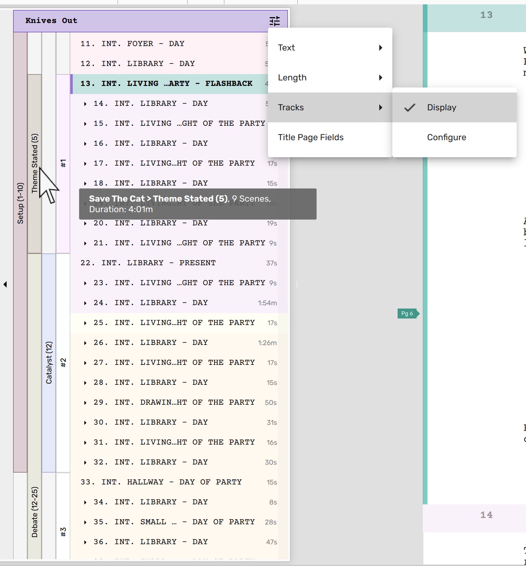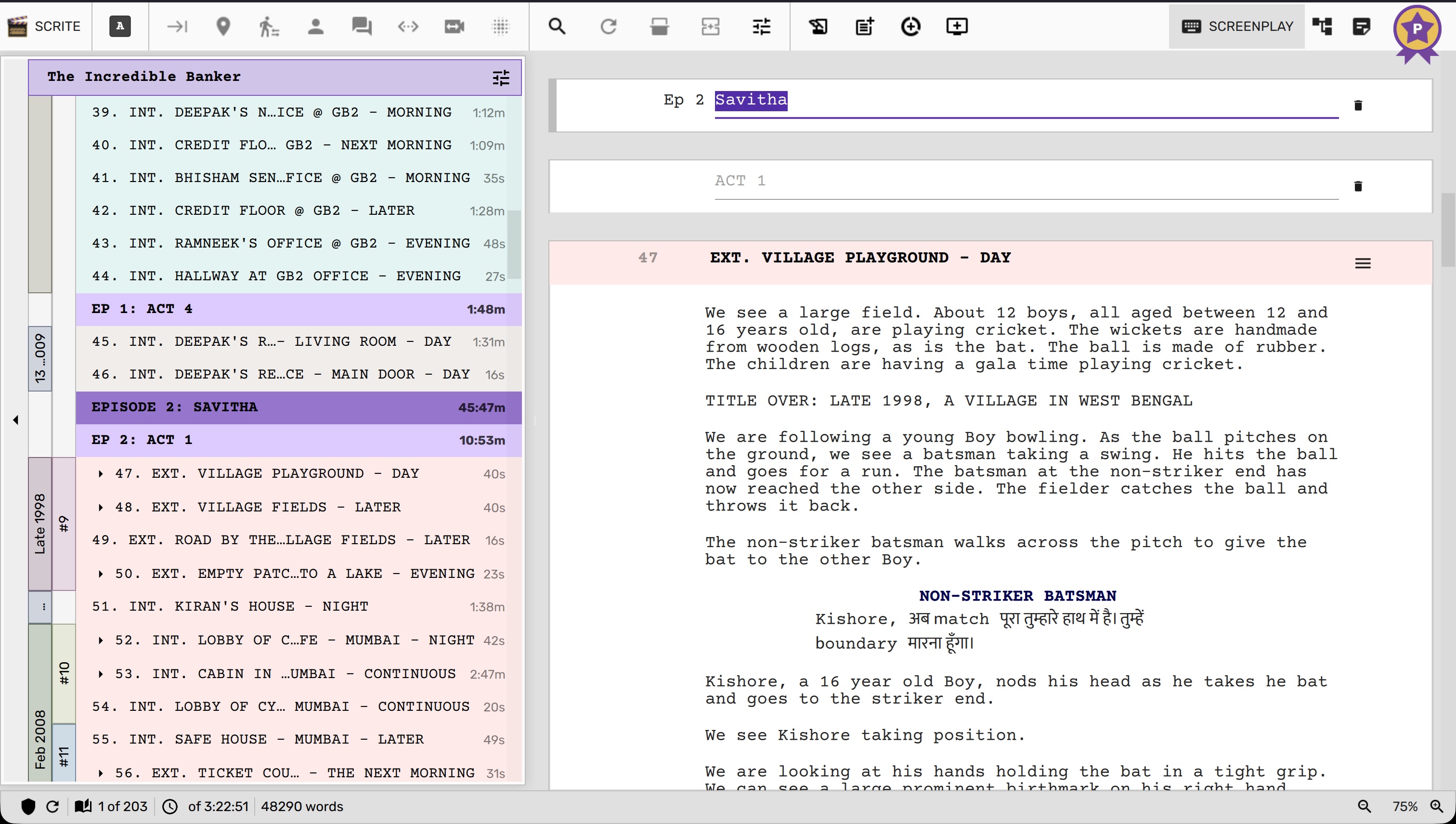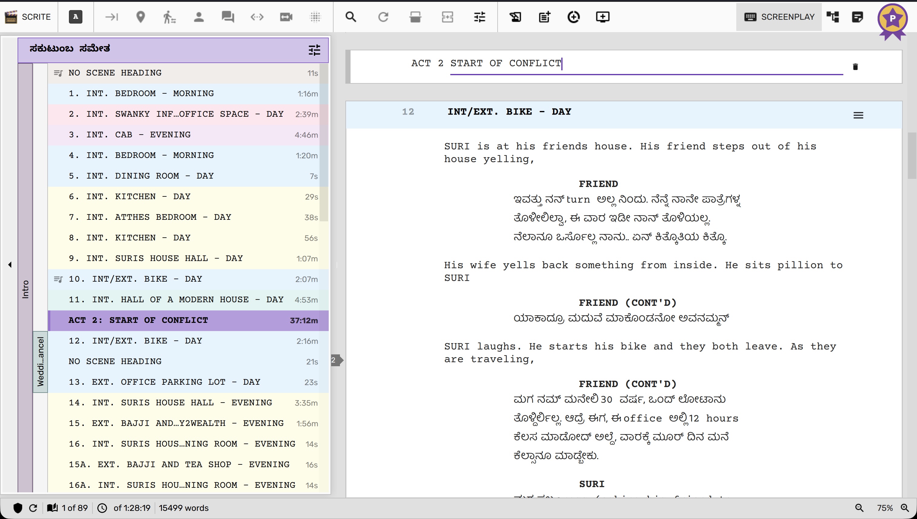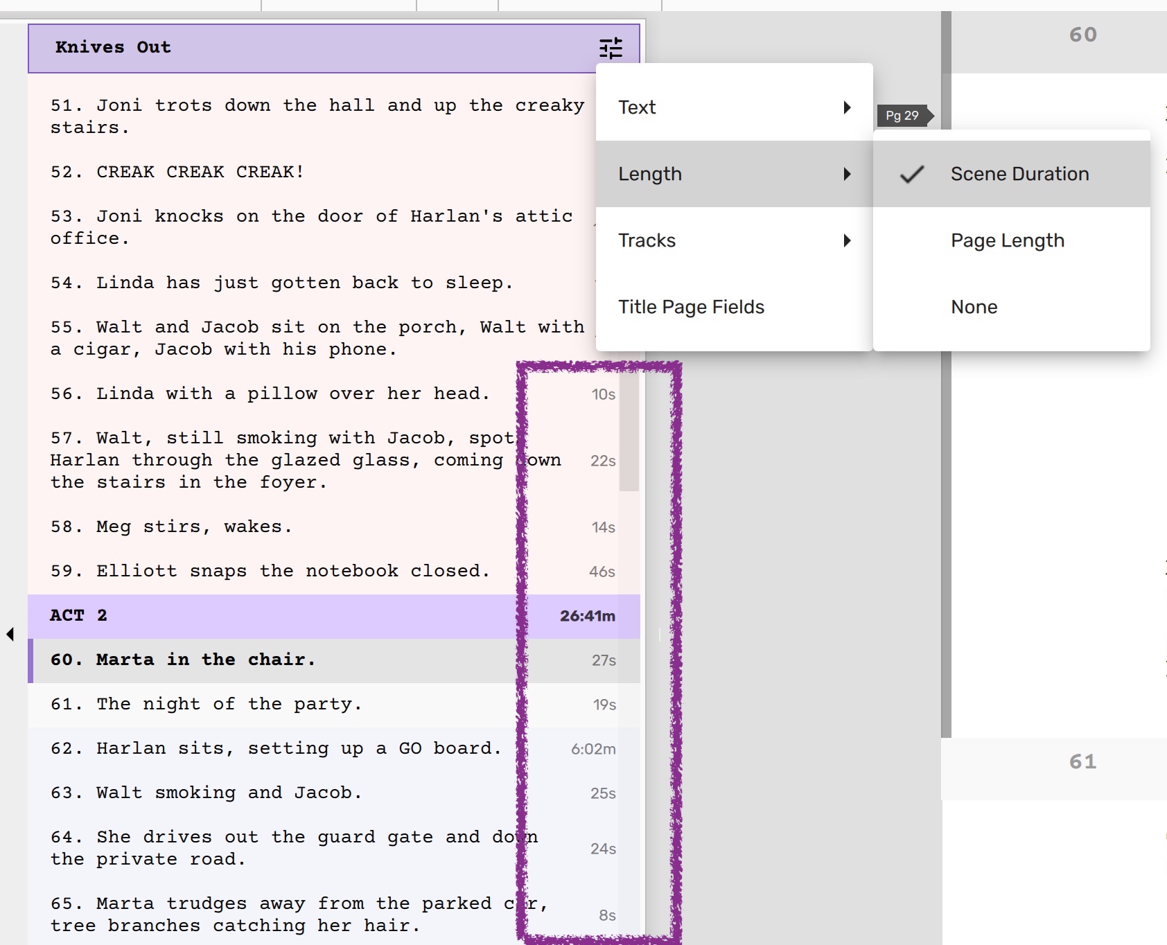 Notice how the scene list panel shows aggregate time for act breaks. This helps in getting a quick impression of pacing in your screenplay.