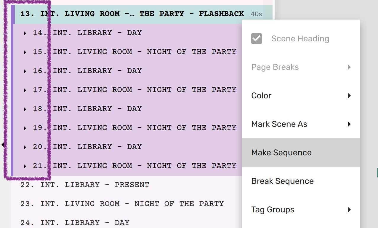 As a writer you may want to bundle multiple scenes into a sequence, because they all form a logical group in your story. Simply select a range of scenes and bundle them together into a sequence.