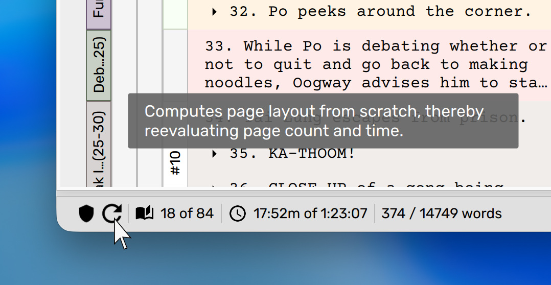 Scrite automatically recalculates page count and time estimate as you type in a background thread. You can, however, force a full refersh of these estimates by clicking on the reload icon in the status bar.