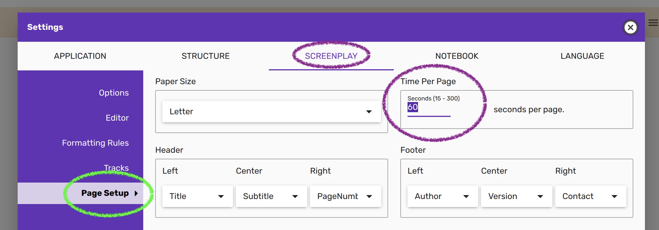 Time values are approximate (1 page ≈ 1 minute). You can adjust 'Time Per Page' in Settings → Screenplay → Page Setup.
