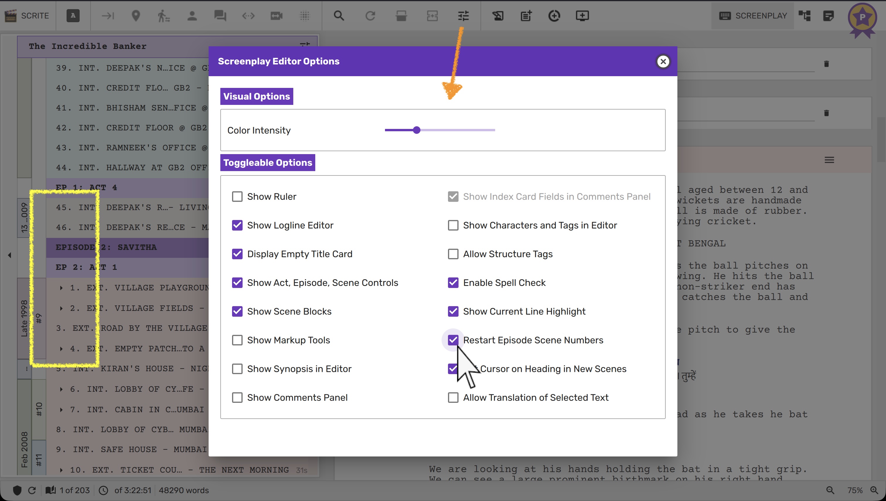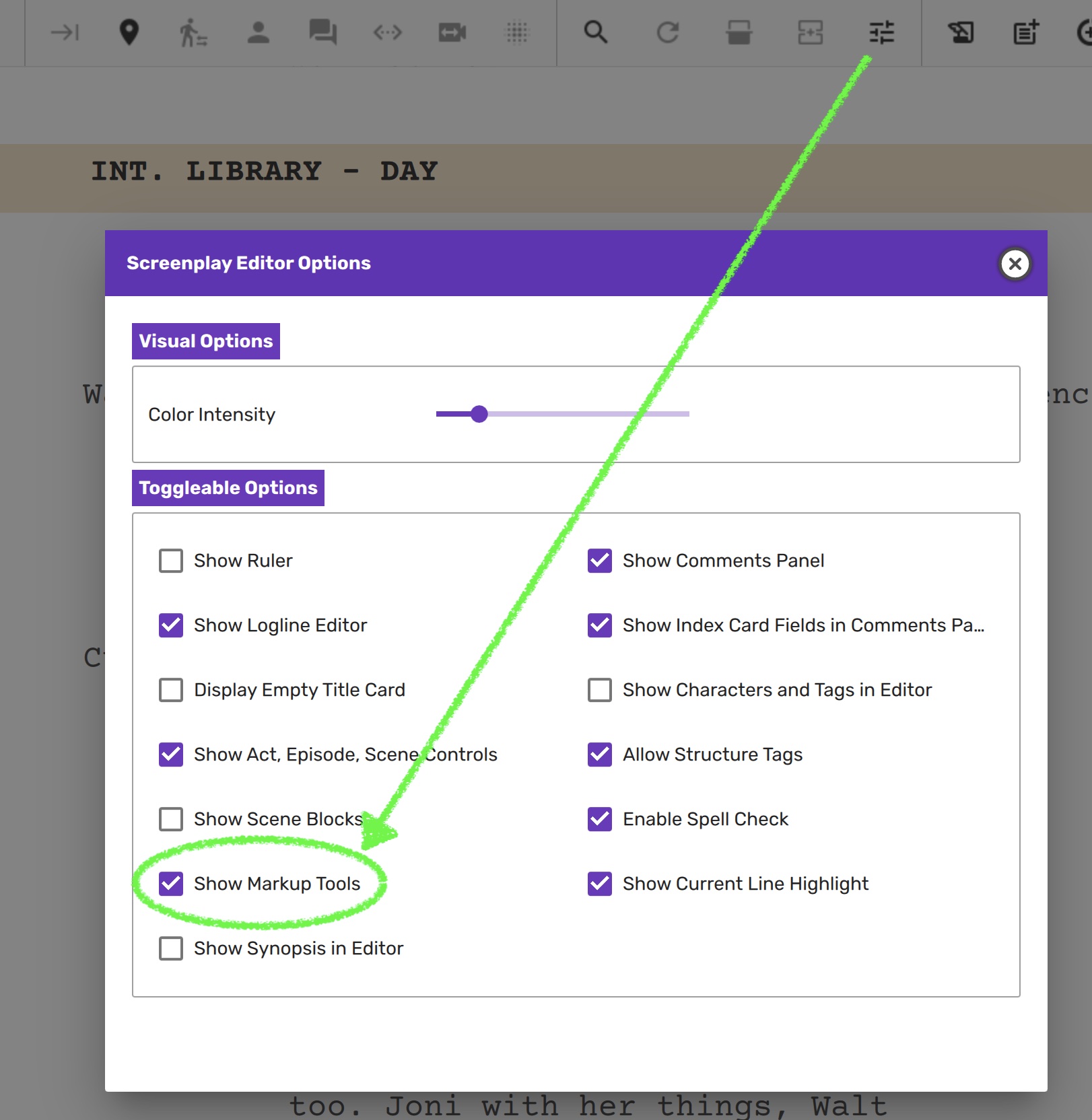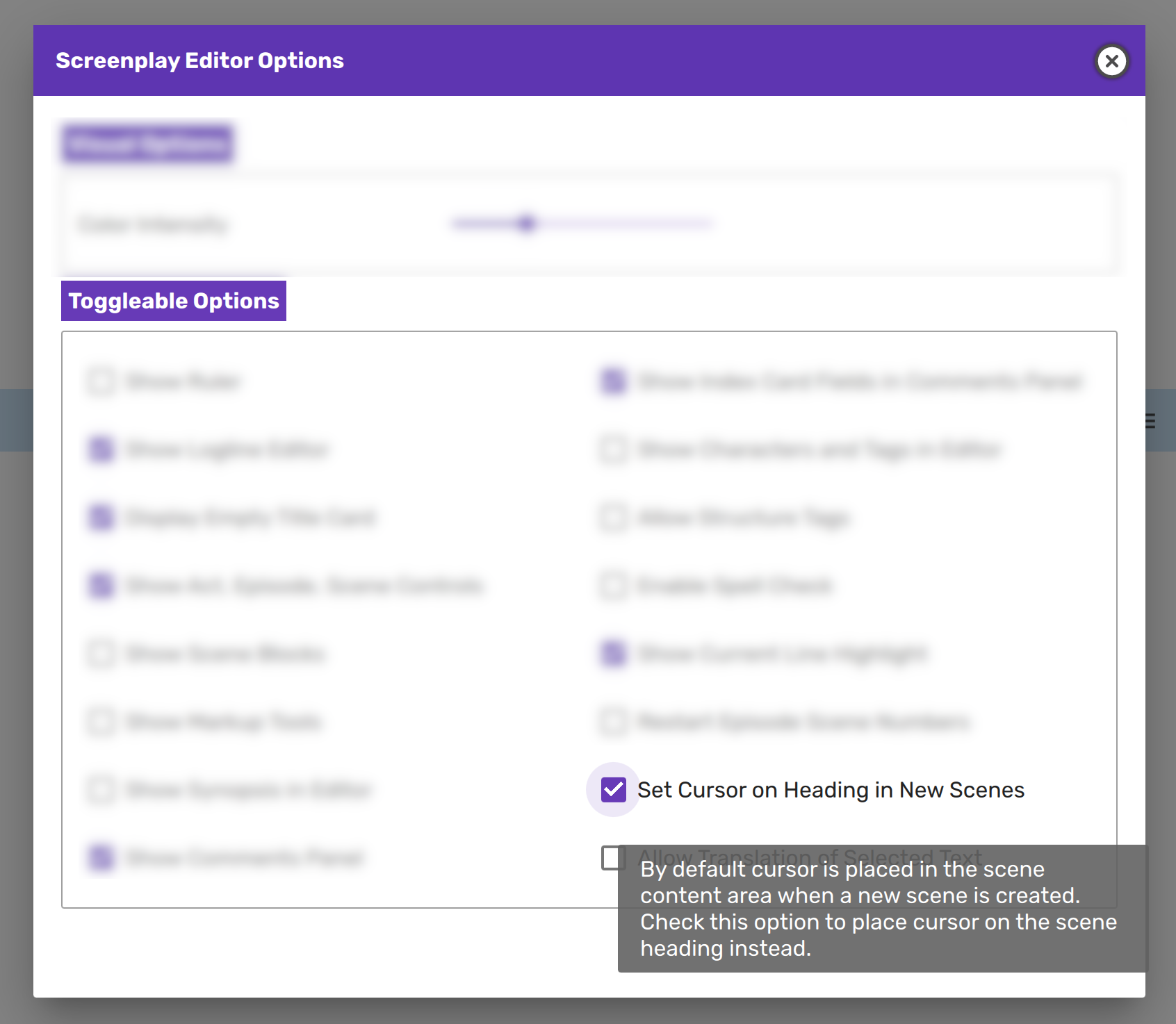Some writers prefer to see intense colors for their scenes, and some prefer subdued colors. You can change the color intensity by clicking on Screenplay Editor Options Dialog, and dragging to color intensity slider as you see fit.
