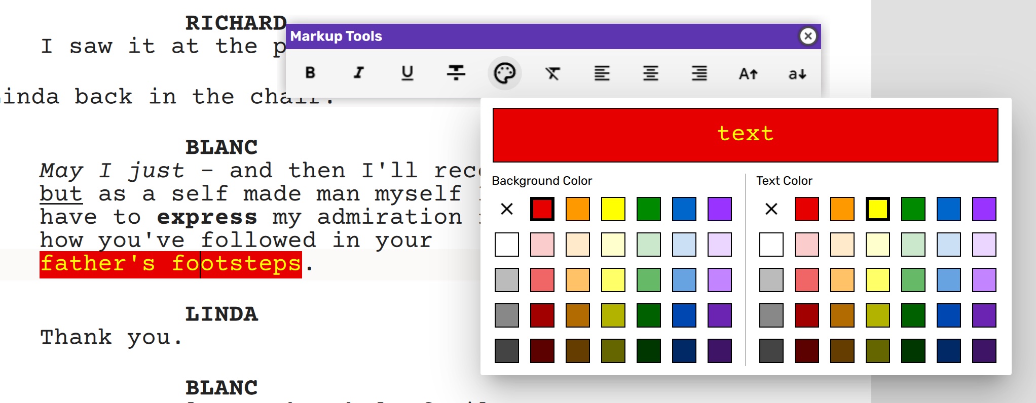Markup Tools let you apply inline formatting to specific snippets of text. The Markup Tools dock is hidden by default; toggle it from the Screenplay Editor Options menu. You can move the dock to any part of the screen.
