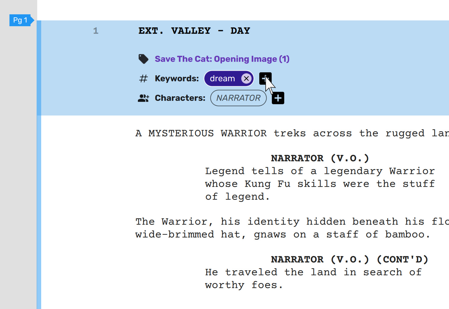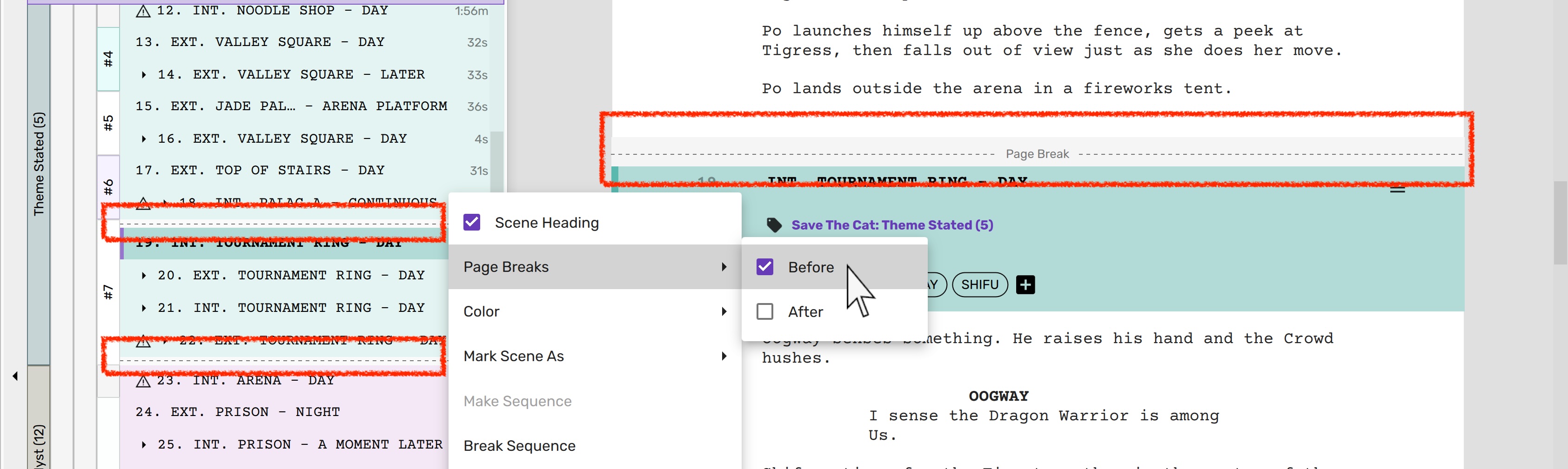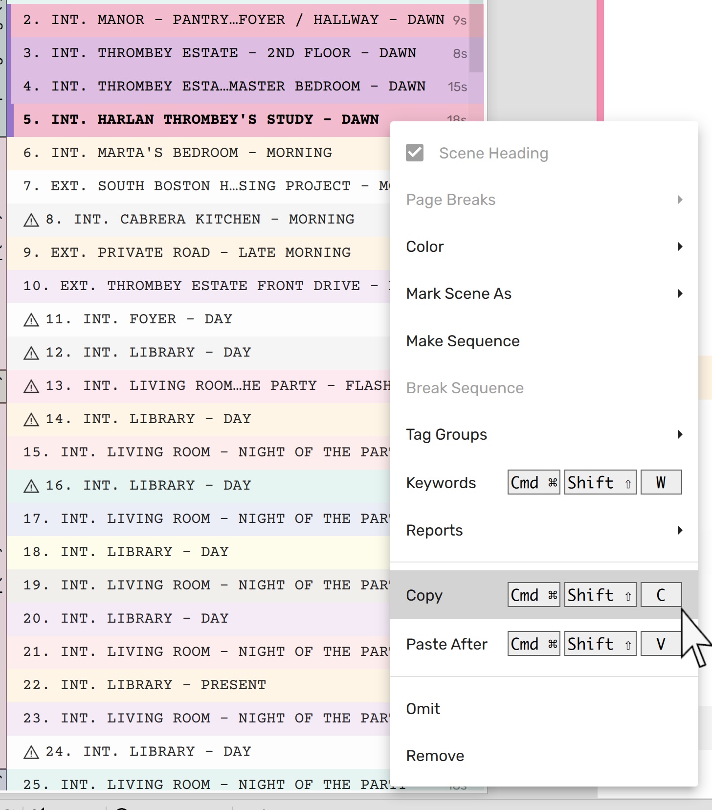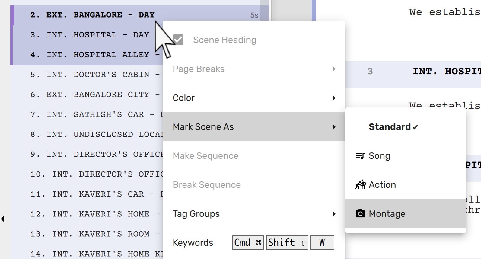You can easily add/remove scenes to a sequence by using the context menu. Bundling scenes together like this allows you to capture rich detail about the way you look at elements of the story unfolding across scenes in the screenplay.