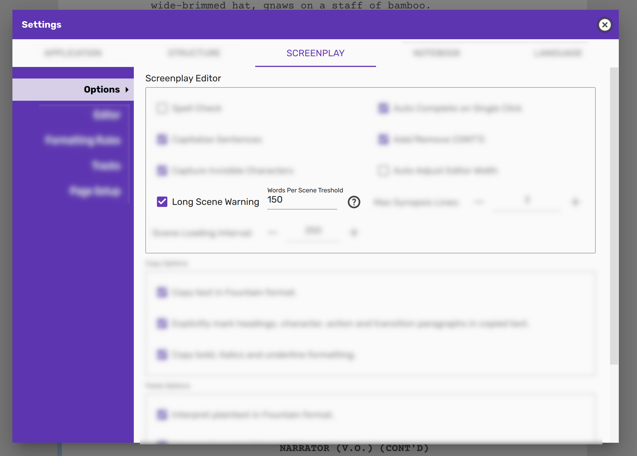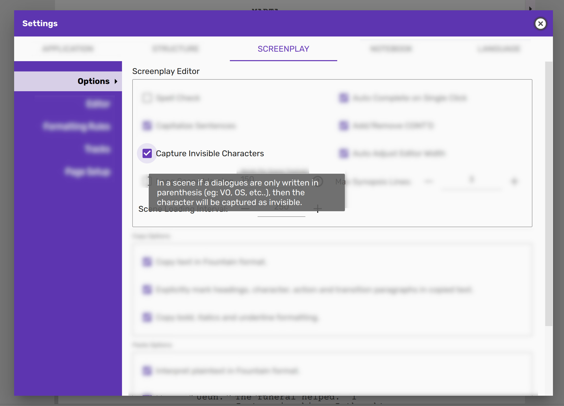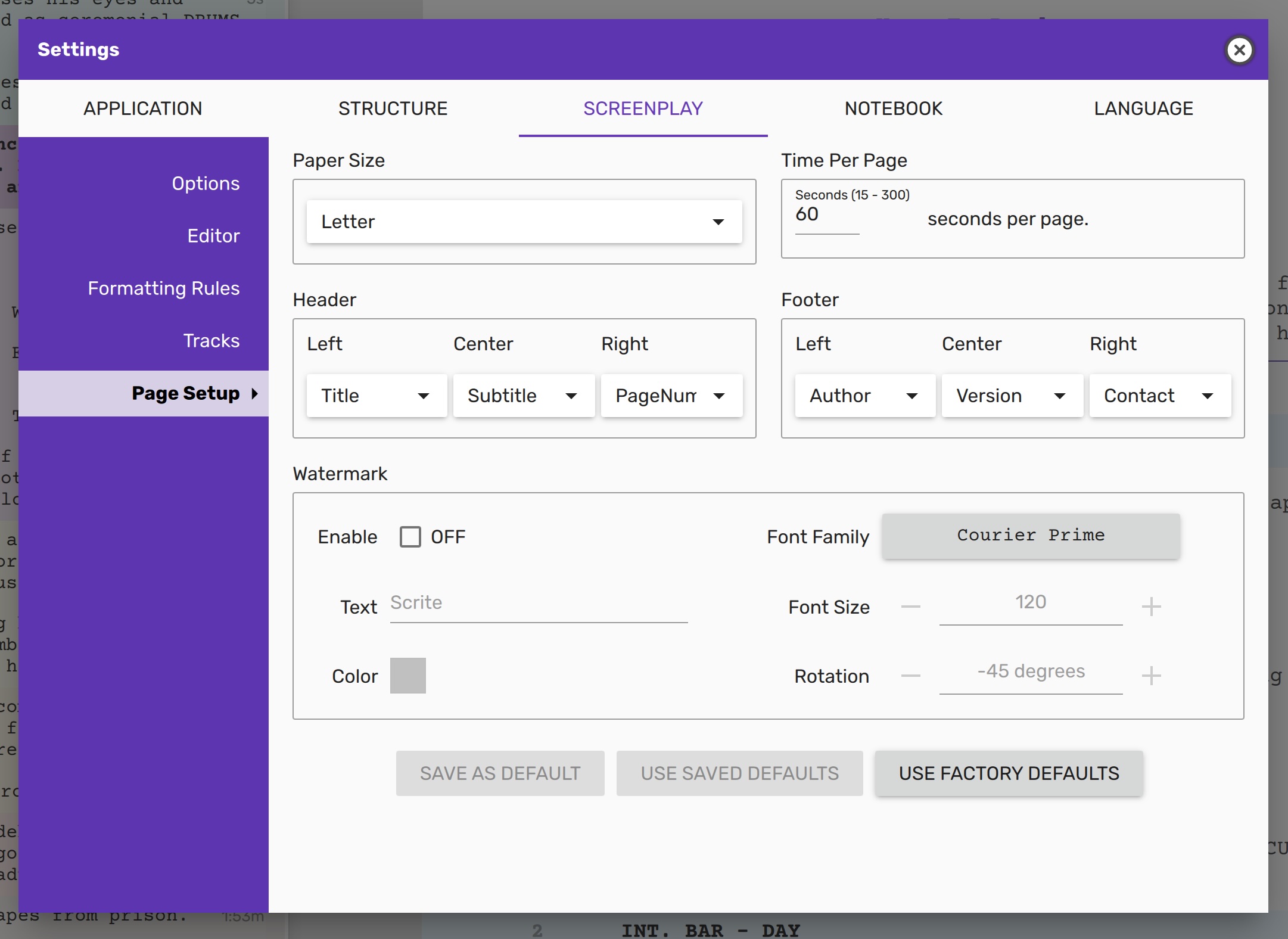 Formatting options are saved with the file and reused each time you open it, even if another file used different options. Scrite maintains two sets of formatting options: