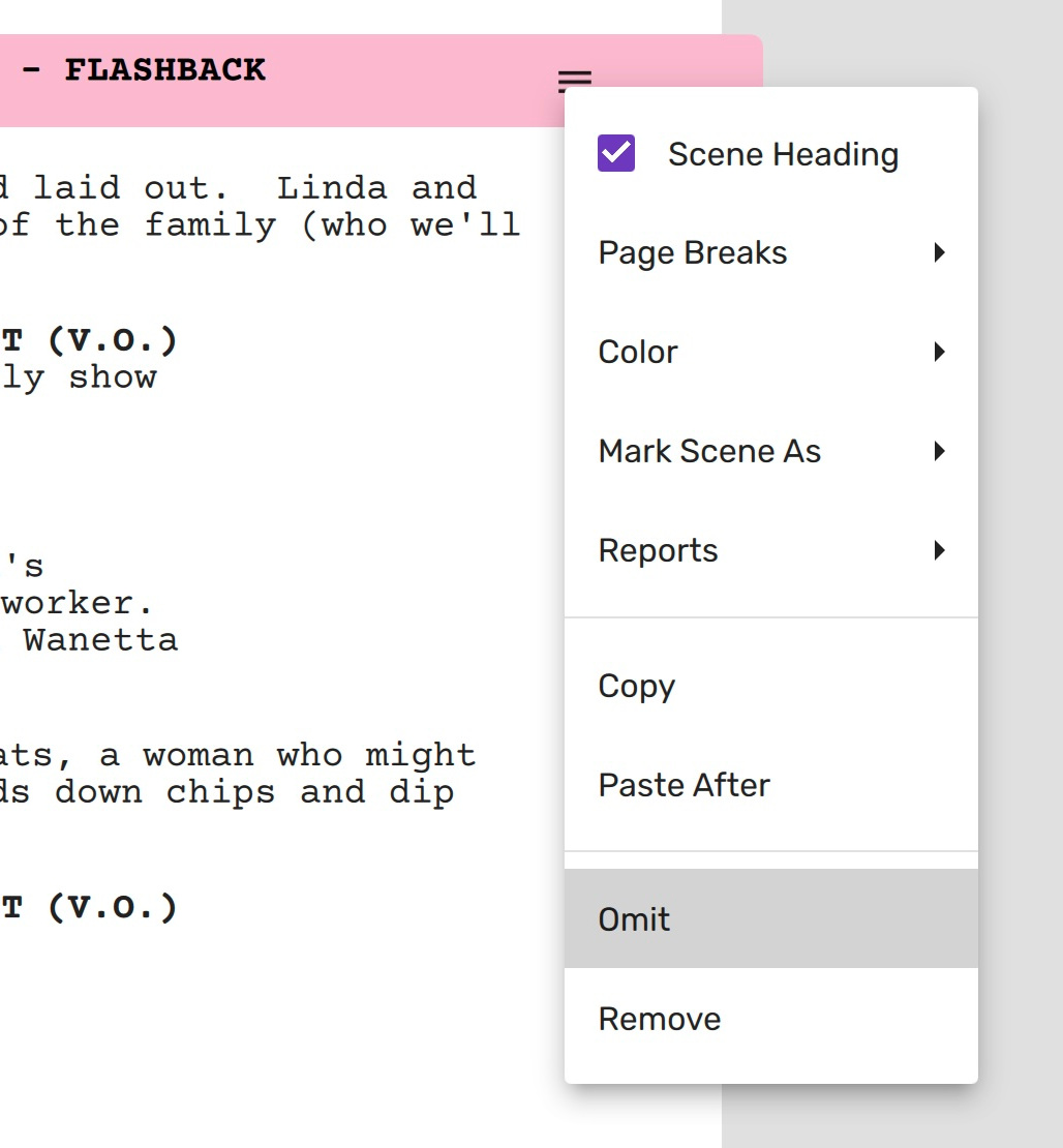 Omitted scenes appear in the screenplay but are hidden in the UI and generated PDFs. This reduces the screenplay’s time and page count. You can click the "Include" button to bring them back.