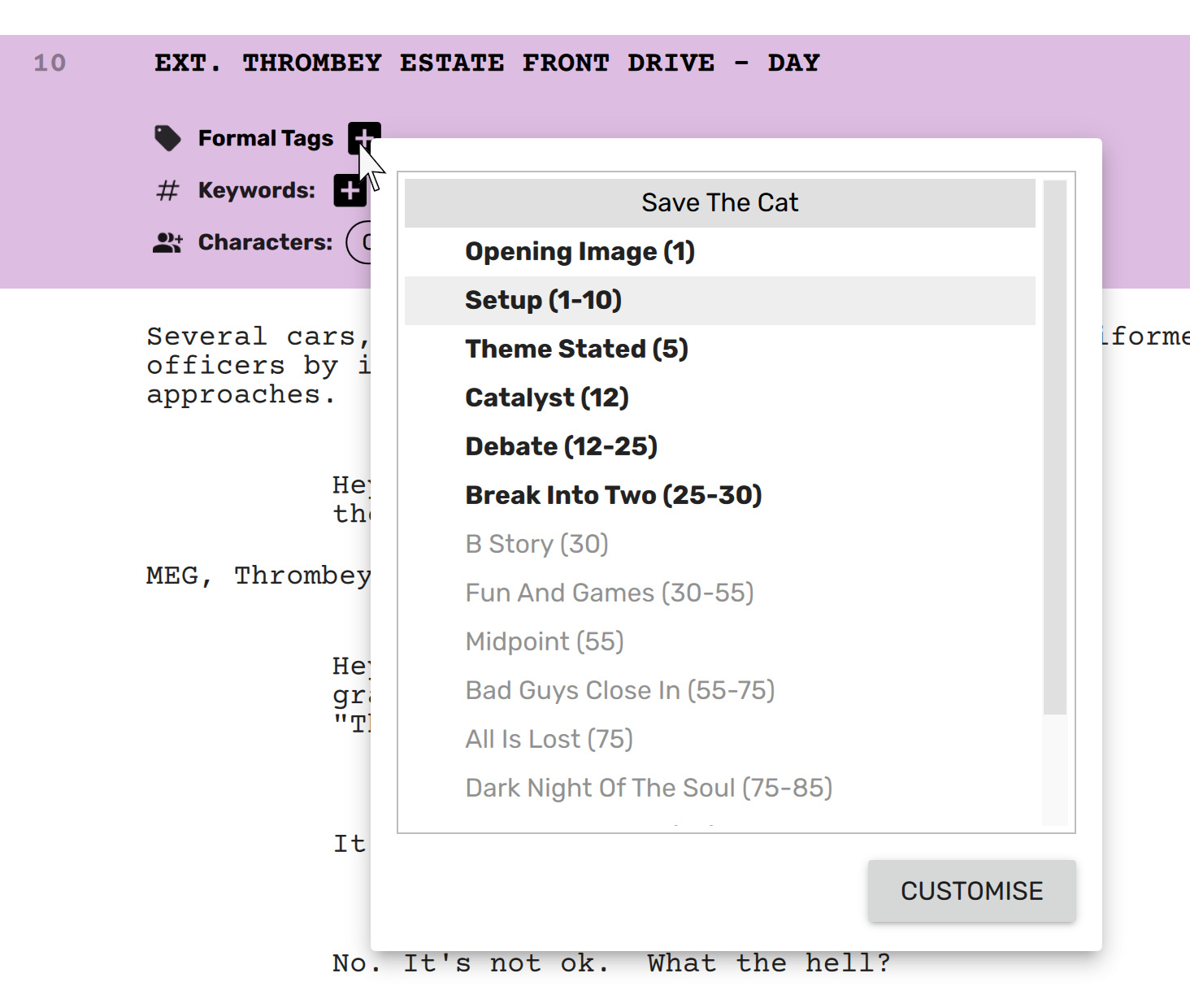 Scrite lets you tag keywords and formal story beats (from Save The Cat, or your own beat sheet) against each scene, or on a bunch of them at once. You can enable the display of tracks to get a quick overview of story elements along side the scene headings in the scene list panel.