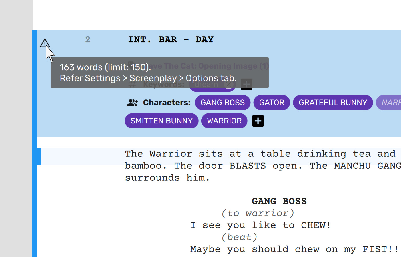 By default, Scrite displays a warning icon next to scenes that have more than 150 words.