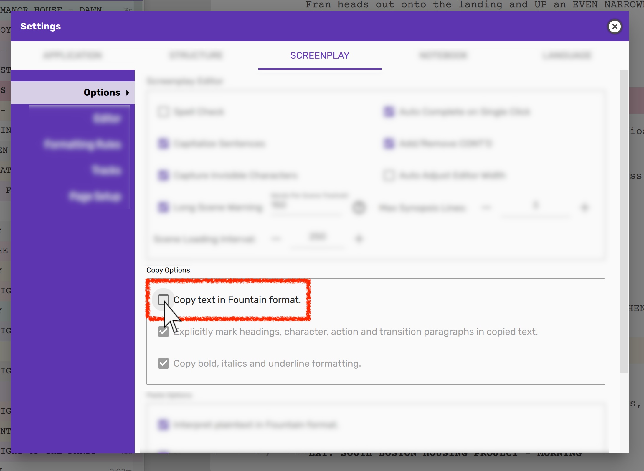 The benefit of copying text in Fountain format is that it makes pasting into Scrite, or 3rd-party screenwriting apps more productive because Fountain preserves formatting.