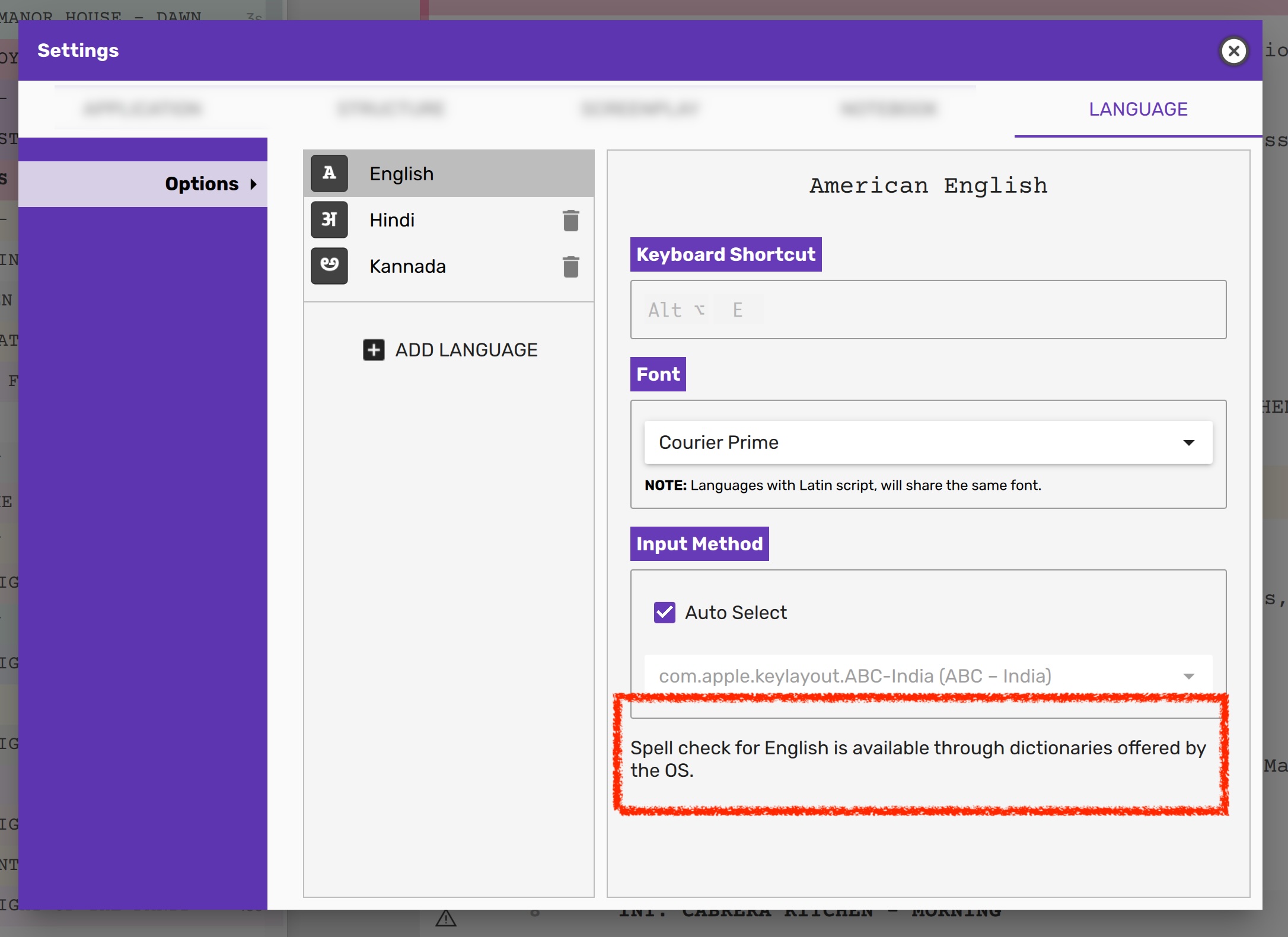 NOTE: Scrite completely relies on the operating-system to drive the spell-check functionality. It does not come bundled with a dictionary of its own.