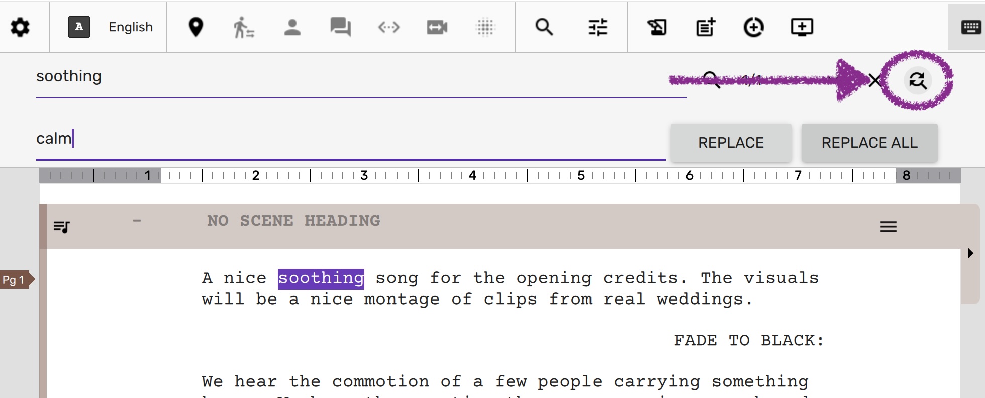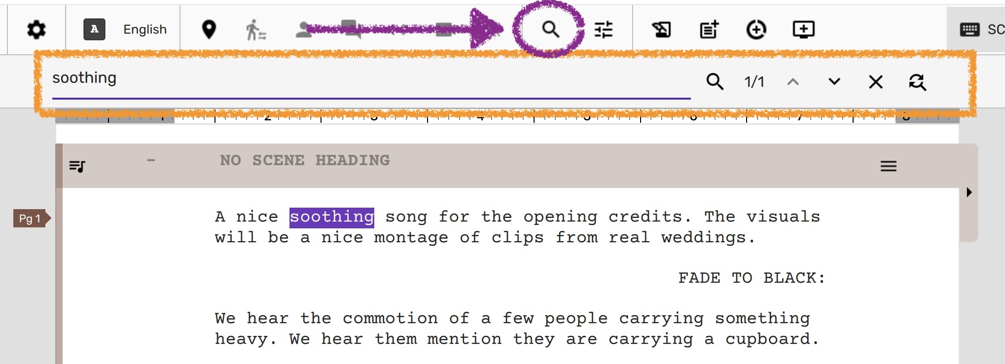 below) to pull up the Find panel along the top edge of the screenplay editor.