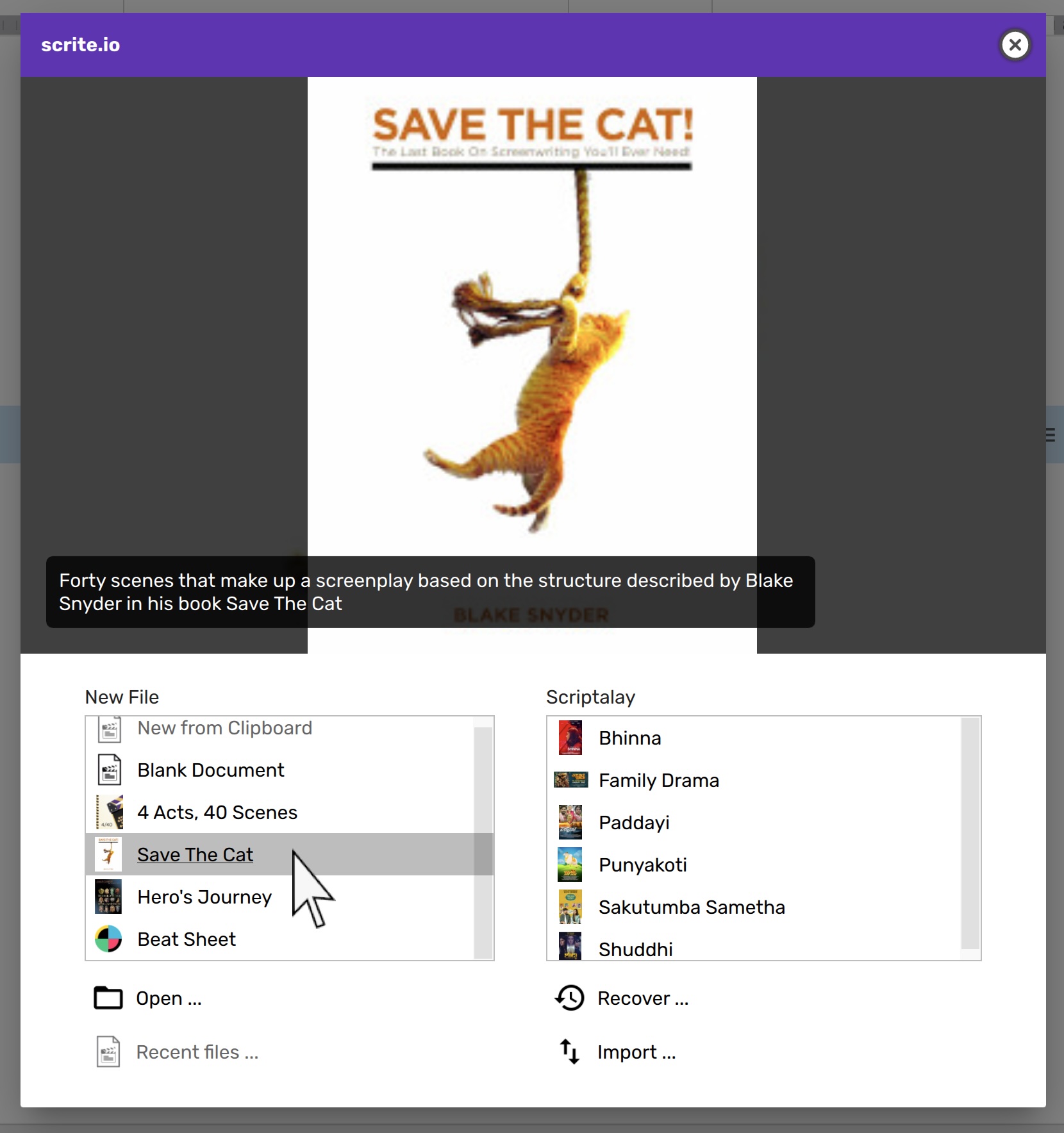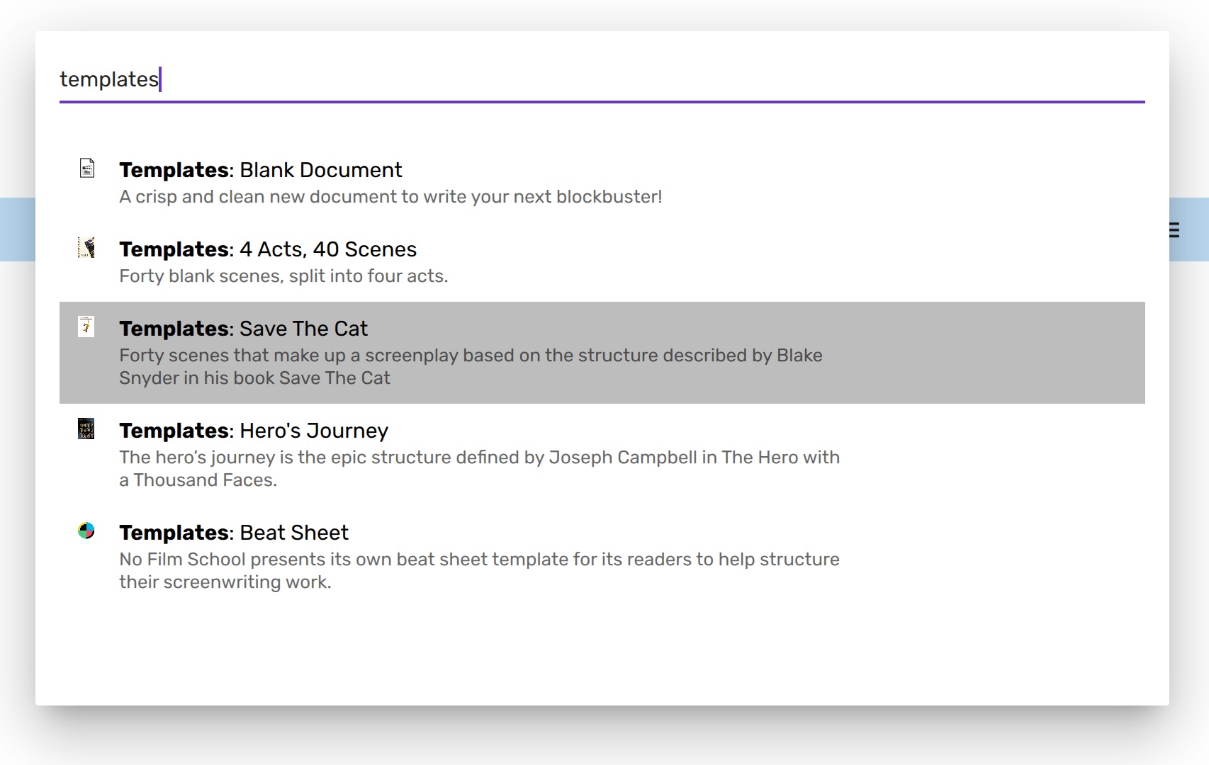 Scrite’s Templates feature offers a set of ready‑made story structures that you can use to jump‑start a new screenplay or to copy into an existing project. Some template come with their own beatsheet to tag index cards and maps the story flow on the Structure Canvas.