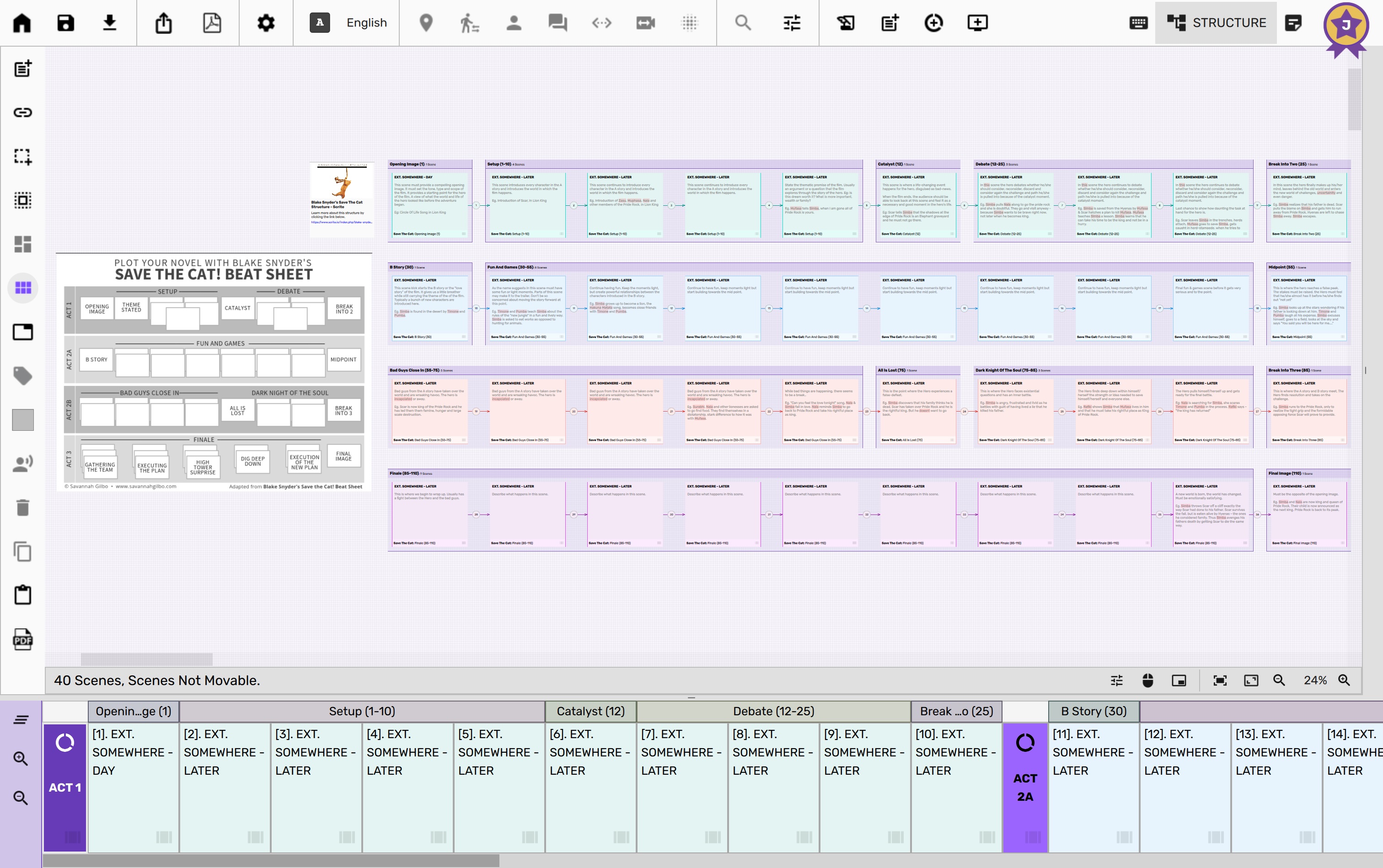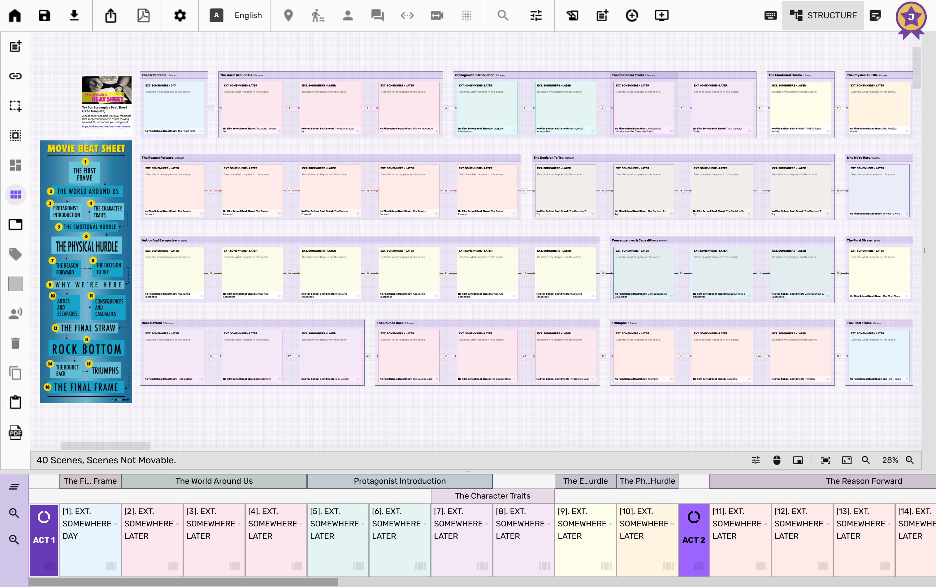 Based on Blake Snyder’s Save the Cat framework, this template includes the 15‑beat structure (Setup, Catalyst, Debate, etc.) and automatically tags each beat on the beatsheet.