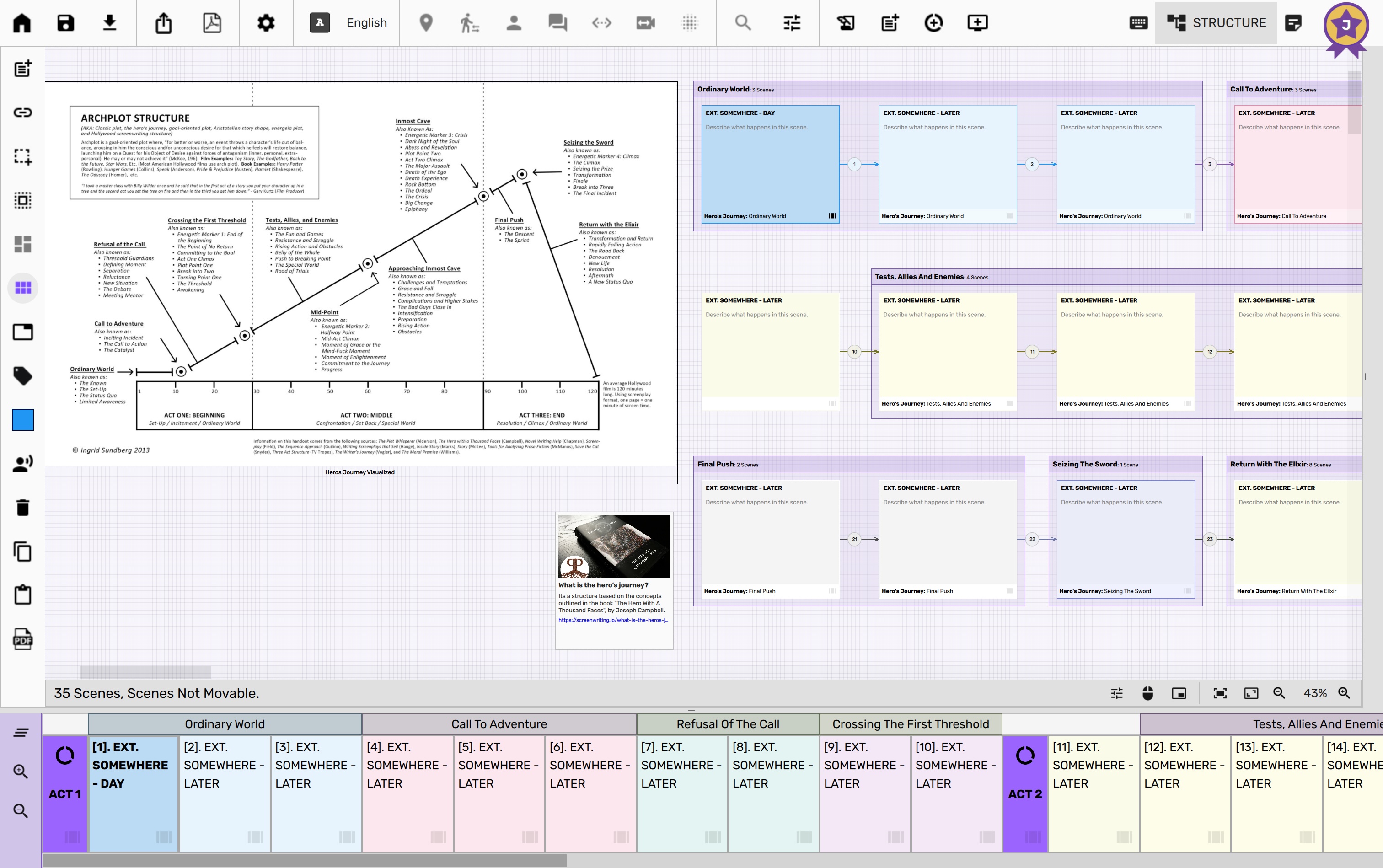 Derived from Joseph Campbell’s monomyth, this template provides the 12 stages (Ordinary World, Call to Adventure, etc.) and places them on the Structure Canvas for easy visual tracking.